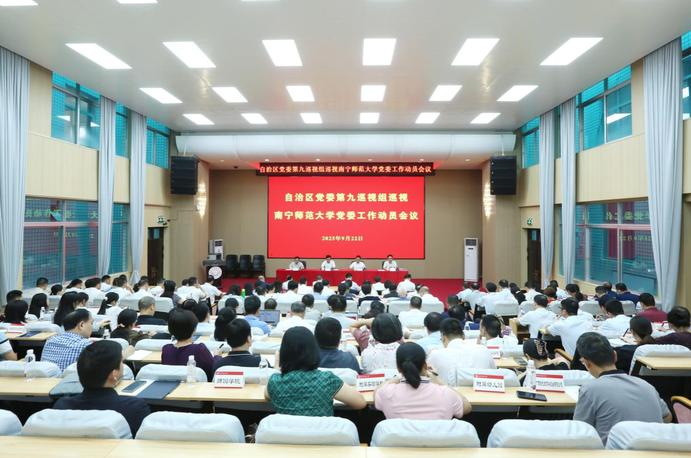 根据自治区党委统一部署,2025年9月22日上午,十二届自治区党委第八轮巡视第九巡视组巡视南宁师范大学党委工作动员会议召开。自治区党委第九巡视组组长梁建强受自治区党委巡视工作领导小组委托,就深入学习贯彻习近平总书记重要讲话精神,自觉接受巡视监督,支持配合本轮巡视工作提出明确要求,并通报本轮巡视的主要任务和工作安排。南宁师范大学党委书记张鹏主持会议并作表态发言。