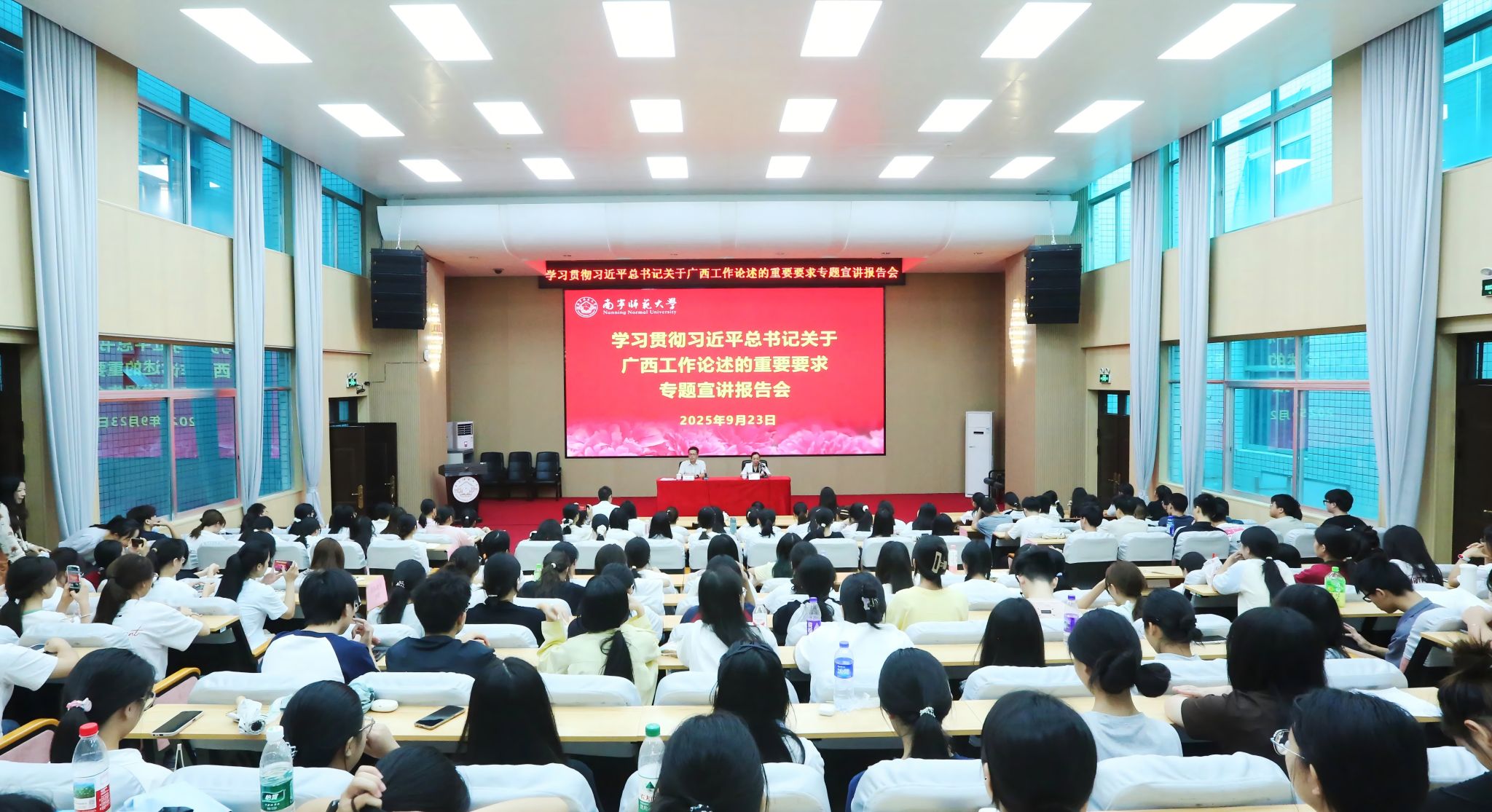 为深入学习宣传贯彻习近平总书记关于广西工作论述的重要要求,推动党的创新理论有效触达青年群体,9月23日下午,我校举行学习贯彻习近平总书记关于广西工作论述的重要要求专题宣讲报告会。校党委书记张鹏作题为《牢记殷切嘱托 贡献青春力量 为奋力谱写中国式现代化广西篇章挺膺担当》的专题报告。报告会由副校长龙妮娜主持。