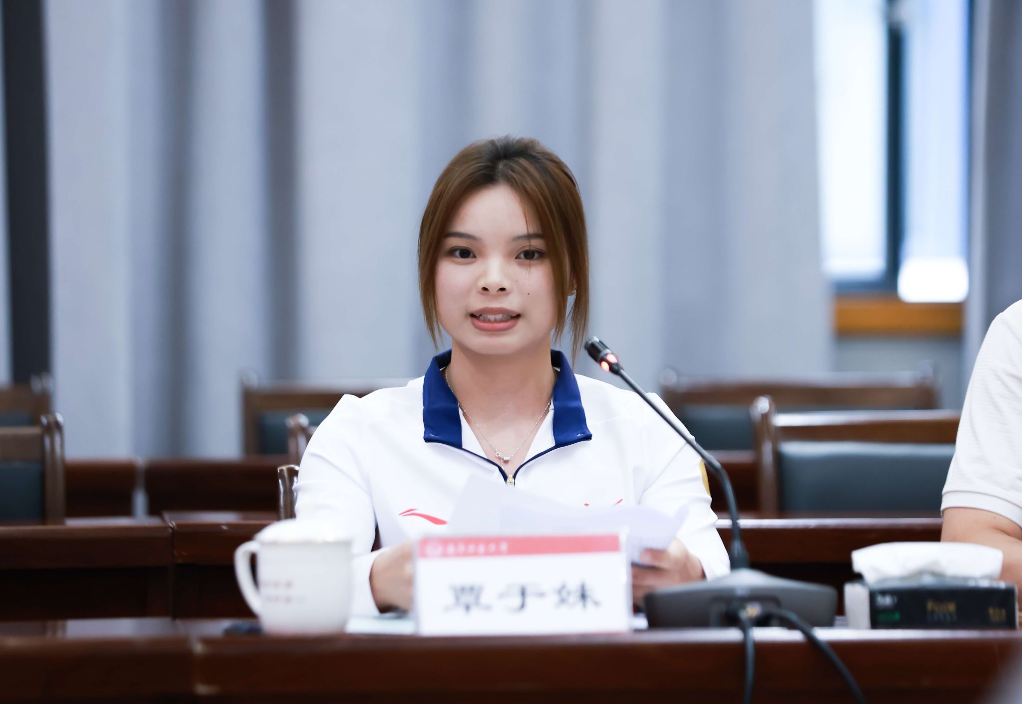 新入学的2025级运动训练专业学生、广西优秀攀岩运动员覃于妹分享了她的感受及未来的学业规划,她感谢自治区体育局的培养与输送,也感谢南宁师范大学提供的宝贵学习机会,表示将珍惜校园时光,努力实现运动成绩与学术修养的双重提升,继续为广西和国家争光。