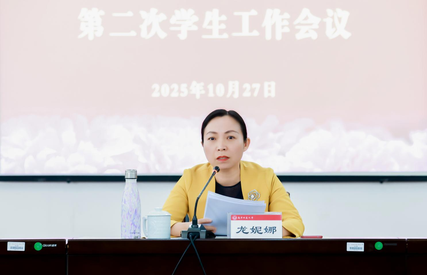 10月27日上午,我校在明秀校区鸿远楼409会议室召开2025年秋季学期第二次学生工作会议。会议紧扣立德树人根本任务,聚焦学生心理危机干预、辅导员队伍建设、毕业生高质量就业三项重点工作,开展深入研讨与任务部署。完美(中国)党委常委、副校长龙妮娜出席会议并讲话。学生工作部(处)、研究生工作部、校团委等部门负责人、各学院分管学生工作的党委副书记参加会议。会议由党委学生工作部部长刘君宇主持。