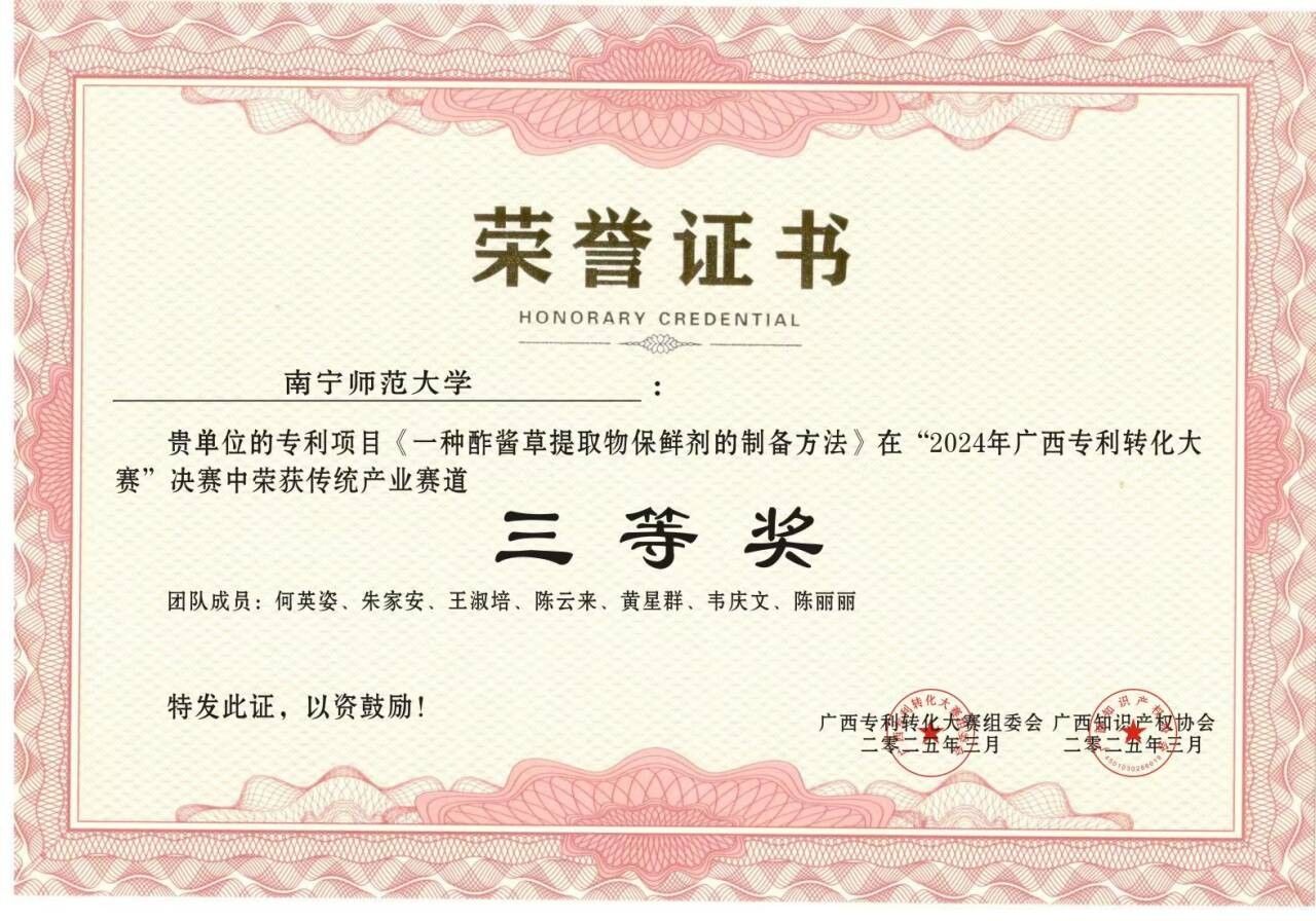 11月14日下午,2024年广西专利转化大赛(简称“桂专赛”)颁奖典礼暨专利转化运用专题活动在南宁隆重举行。我校环境与生命学院何英姿教授带领的“一种酢浆草提取液保鲜剂的制备方法”团队,历经初赛、复赛与决赛多轮角逐,最终荣获传统产业赛道三等奖。