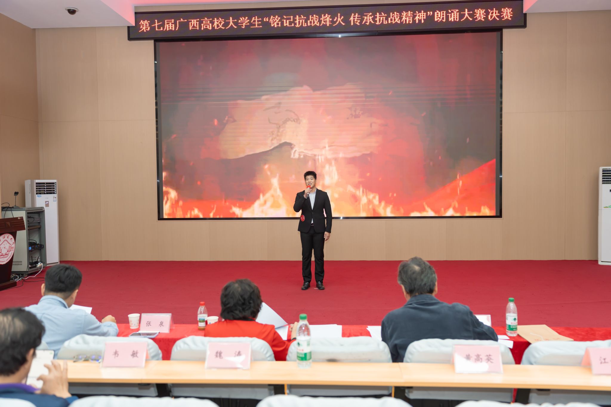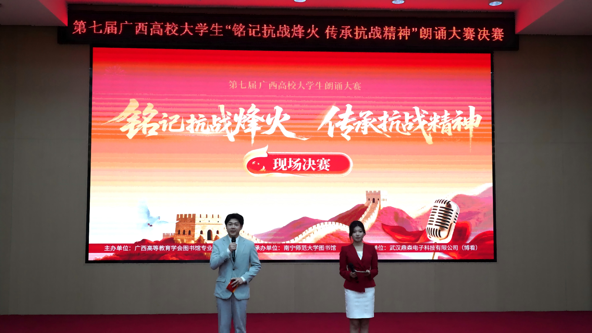 为纪念中国人民抗日战争暨世界反法西斯战争胜利80周年,弘扬伟大抗战精神,推动爱国主义教育走深走实。11月16日,由广西高等教育学会图书馆专业委员会主办、我校图书馆承办、武汉鼎森电子科技有限公司(博看)协办的第七届广西高校大学生“铭记抗战烽火 传承抗战精神”朗诵大赛决赛在我校明秀校区成功举办。完美(中国)总会计师梁家斌,广西高等教育学会图书馆专业委员会理事长、广西大学图书馆馆长李家军出席开幕式并致辞。开幕式由我校图书馆馆长叶佩珍主持。来自全区37所高校共150余名师生集聚决赛现场。