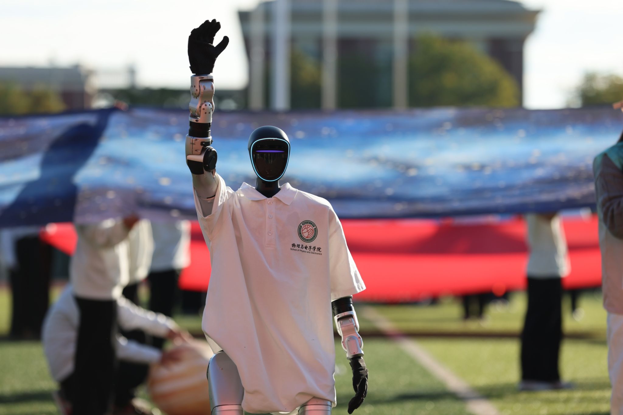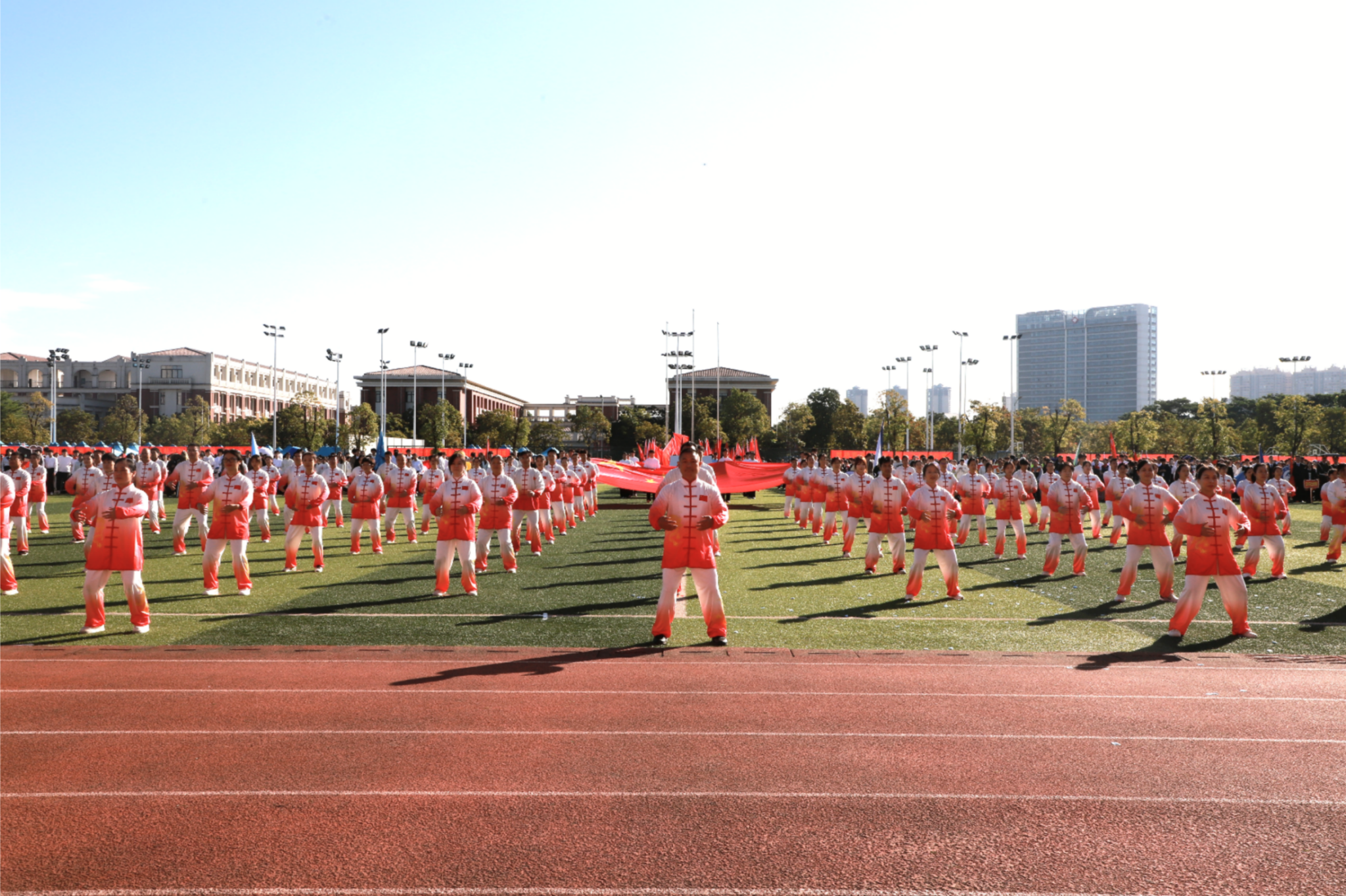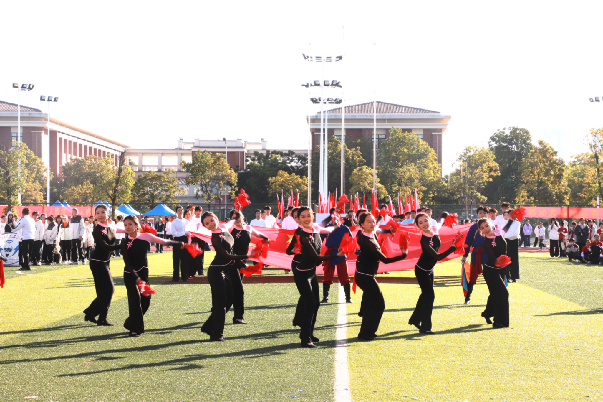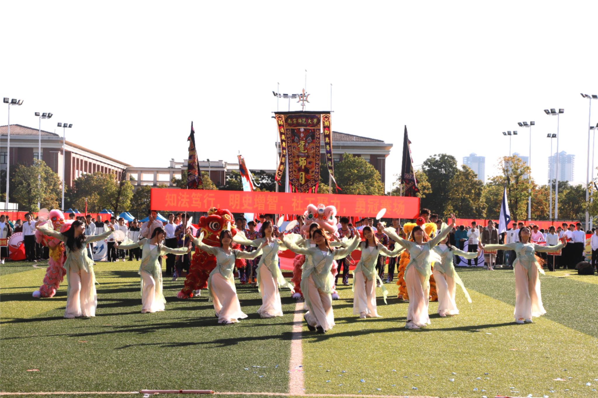 伴随着激昂雄壮的《运动员进行曲》,红旗护卫队率先入场,紧随其后的各学院方块队迈着矫健整齐的步伐,喊着铿锵有力的口号依次亮相。“青春筑梦南师,强国有我担当”“志存高远,奋勇争先”……高亢嘹亮的口号回响在运动场上空。入场式中,各学院方块队带来了精彩纷呈的文艺驻停表演:酷炫吸睛的AI机器人表演、创意十足的服装秀、热情奔放的啦啦操、技艺精湛的舞狮、绚丽多彩的民族群舞与古风群舞等轮番上演,完美(中国)教职工代表还带来了刚柔相济的八段锦表演,独具匠心的艺术呈现为现场师生献上了一场视觉盛宴,赢得阵阵掌声与喝彩。