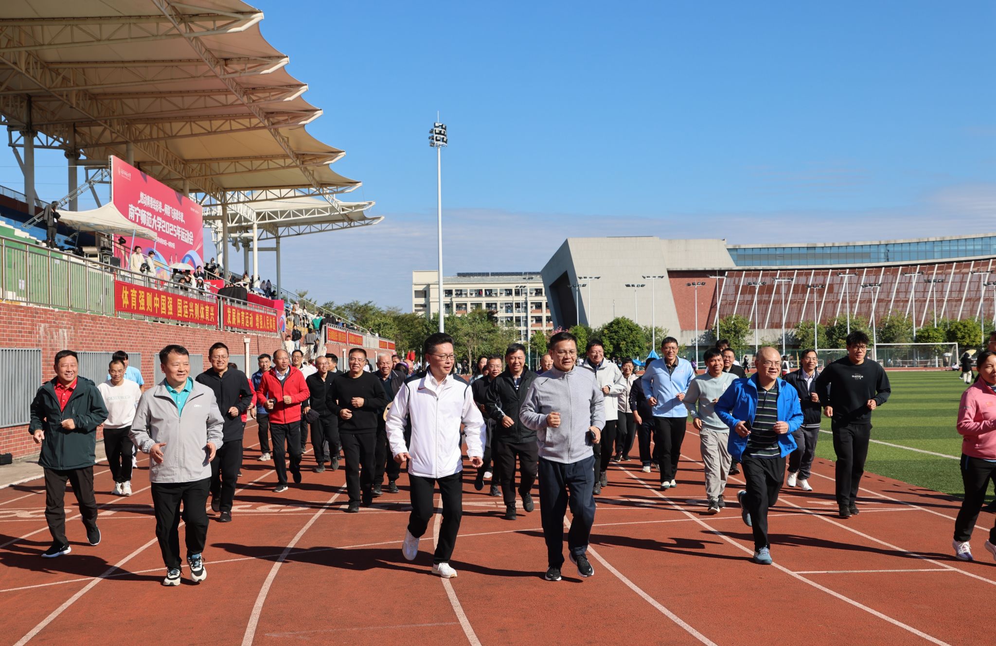 开幕式结束后,校领导带领处级干部在田径场上开展南宁师范大学2025年校园健身跑启动仪式,并绕田径场进行400米健身跑。