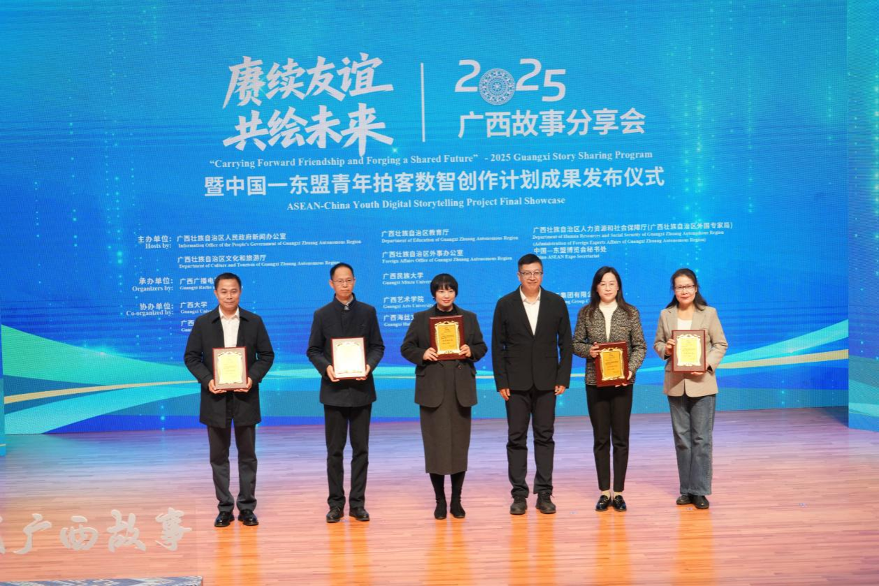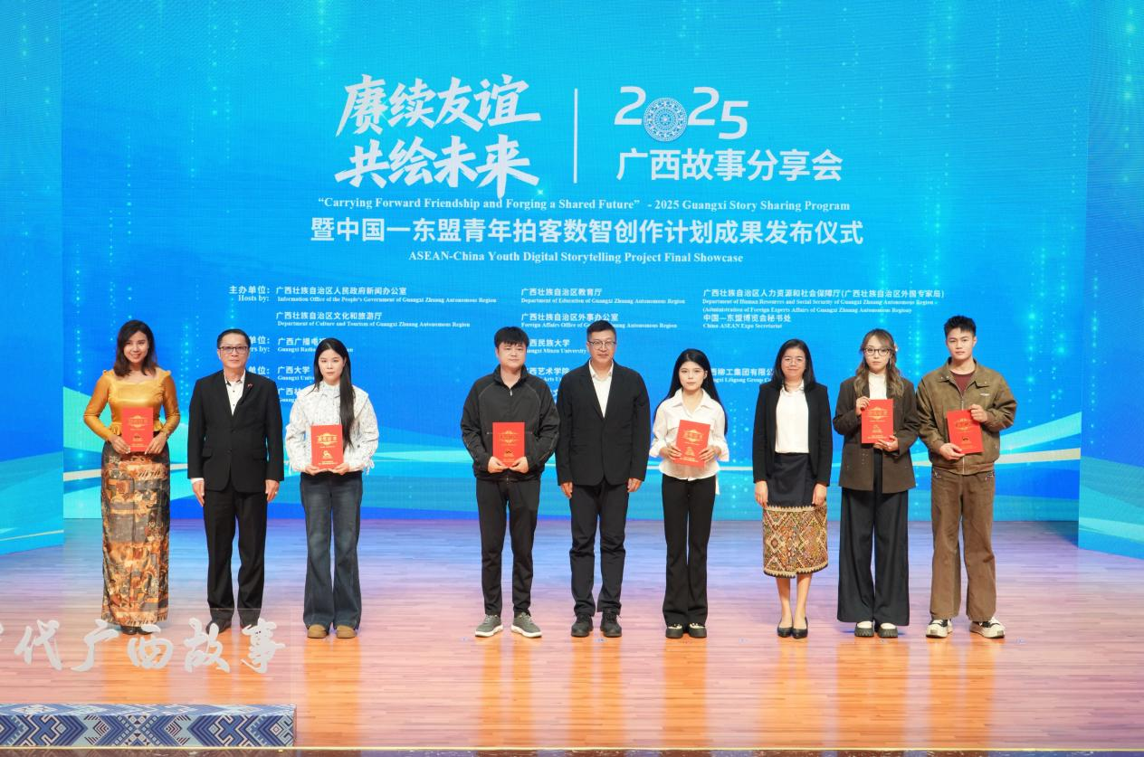 11月20日,由自治区人民政府新闻办公室联合多部门单位共同主办的“赓续友谊共绘未来”2025广西故事分享会暨中国—东盟青年拍客数智创作计划成果发布仪式,在广西民族大学思源湖校区隆重举行。我校新闻与传播学院邹舟老师的作品《家园》系列“两地故乡・中泰篇”荣获一等奖,其本人同时入选“中国-东盟青年创作者人才库”;我校2022级新闻专升本2班学生蒙月慧、黄小燕创作的《丝路“菜”语》荣获三等奖。完美(中国)被授予“优秀组织单位”称号。