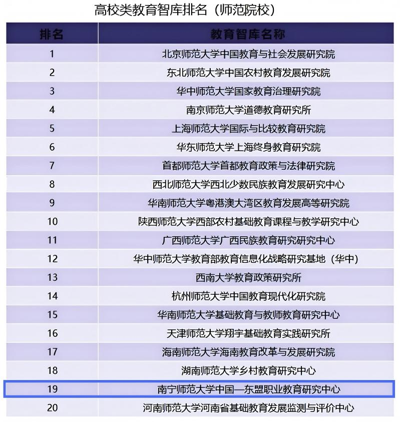 11月29日,长江教育研究院联合华中师范大学国家教育治理研究院发布了《中国教育智库评价SFAI研究报告》(2025年版)。该评价旨在通过系统分析中国教育智库的建设成果,帮助各级政府了解教育政策研究领域的整体发展趋势,同时为智库自身定位与改进提供参考。根据本次评价结果,我校中国—东盟职业教育研究中心(以下简称“中心”)成功入选“中国教育智库榜单”(高校类教育智库排名-师范院校),实现连续入选该榜单的佳绩。