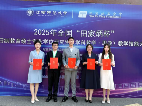 12月5日至7日,2025年全国“田家炳杯”全日制教育硕士专业学位研究生学科教学(思政)教学技能大赛决赛在江西师范大学成功举行,本次大赛吸引全国98所高校的255名教育硕士研究生同台竞技。我校选派的5名选手全部跻身决赛,并斩获一等奖2项、二等奖1项、三等奖1项、优秀教学设计奖1项,获奖等级与总数均位列全国前三,充分展现了我校教育硕士培养的扎实成效。