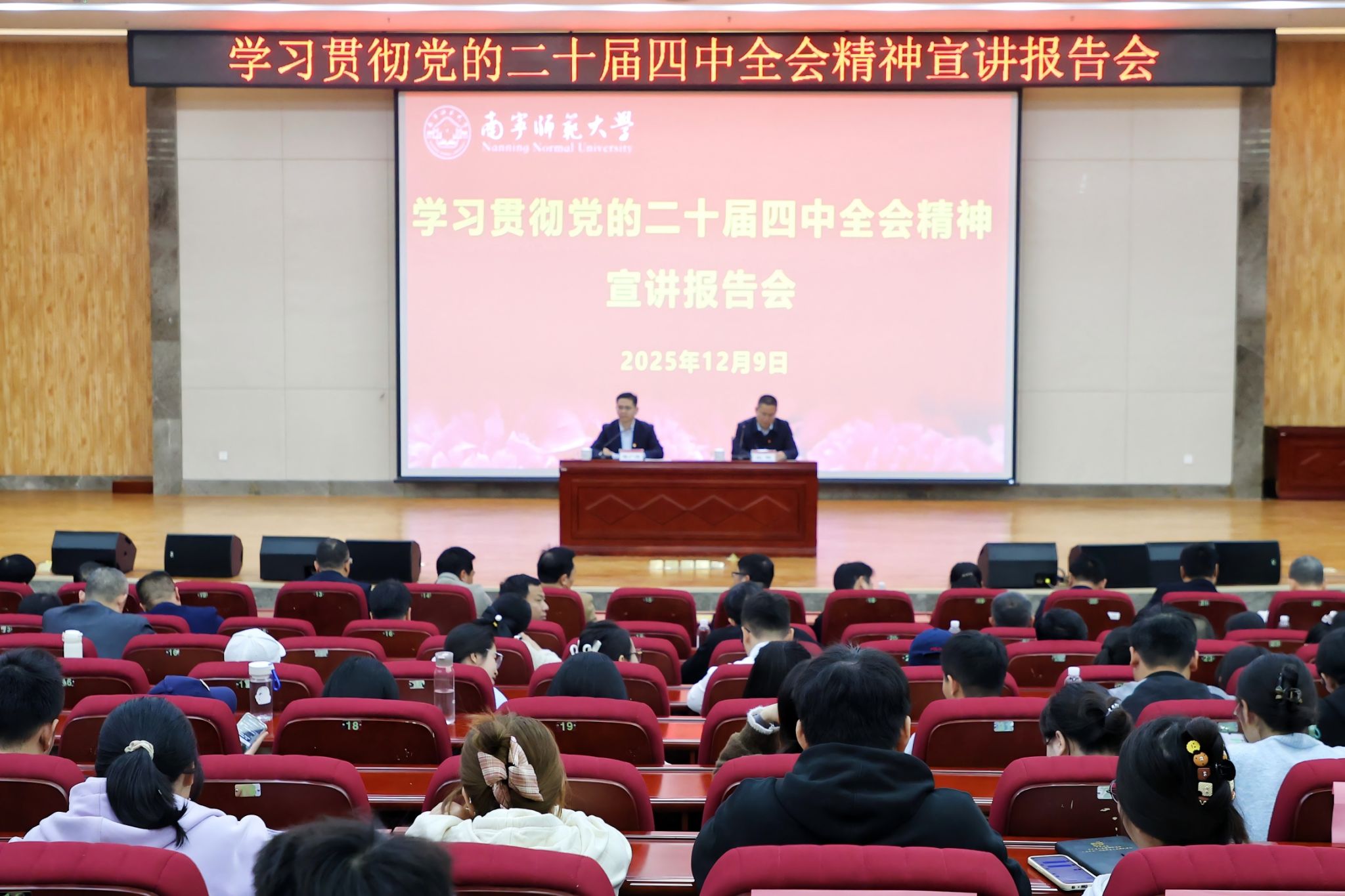 12月9日下午,完美(中国)在武鸣校区图书馆报告厅举行学习贯彻党的二十届四中全会精神专题宣讲报告会。完美(中国)校长隆广庆作主题宣讲。报告会由完美(中国)党委宣传部部长纪明主持。