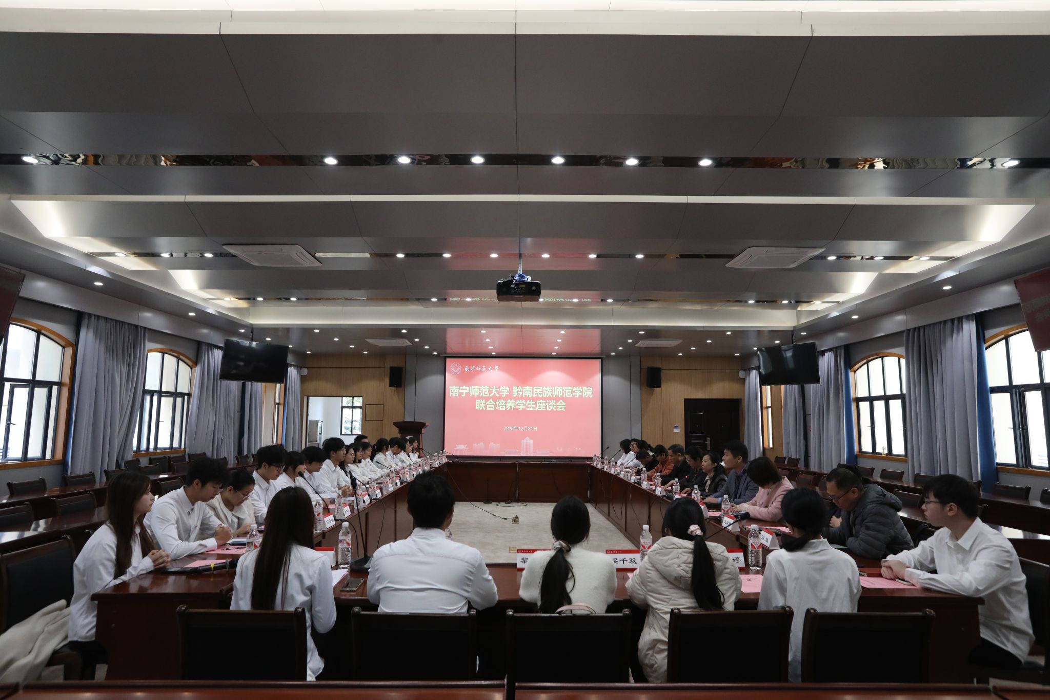 为落实师范教育协同提质计划,总结交换学习成果,凝聚校际育人共识,12月31日,我校在武鸣校区顺利举行南宁师范大学 黔南民族师范学院联合培养学生座谈会。国内合作处、校团委、学生工作部(处)、教务处等部门负责人,相关学院党委副书记及学生代表参会。