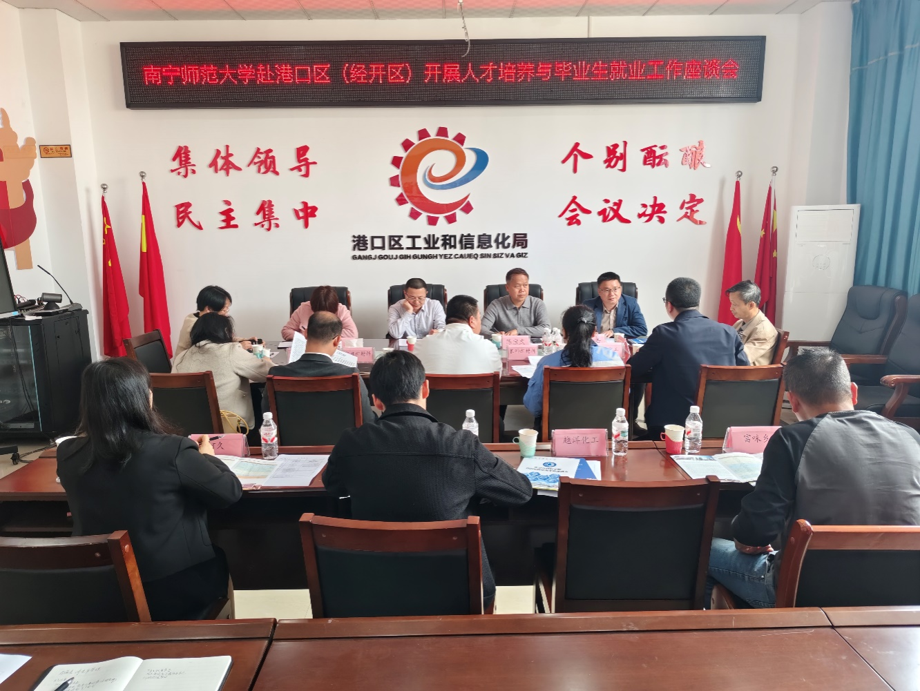 在港口区工信局,局长陈雄作为校友,介绍了区域经济发展情况及人才需求,希望高校为企业输送更多专业对口的人才。参会企业代表分别介绍了用人需求,普遍希望加强学生实习实训,提升毕业生实践能力与企业认同感。王国红诚挚邀请企业来校招聘,并表示将推动产教融合,探索定制化培养与实训基地建设。