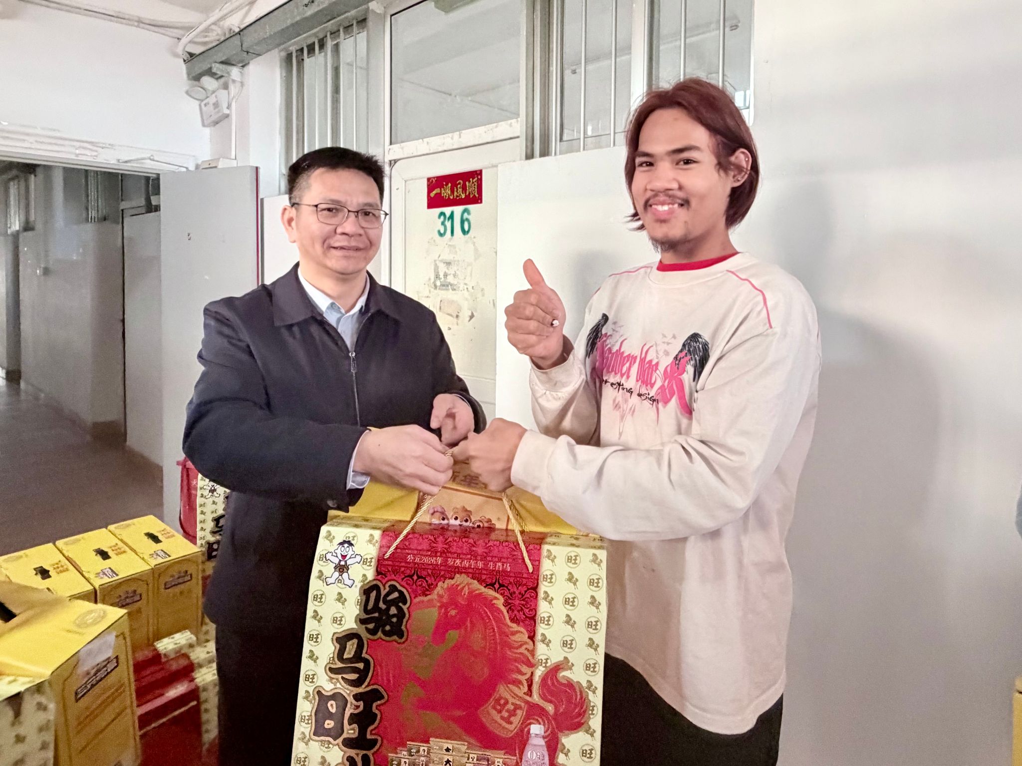 慰问过程中充满了浓厚的节日气氛。隆校长给同学们送上了满载心意的新春大礼包,让远离家乡的学子们倍感温暖。来自泰国的留学生李辉同学开心地分享道:“校长、老师们来看望我们,让我深深感受到了家的温暖。春联上的汉字很美,老师还为我们讲解了其中的美好寓意。”