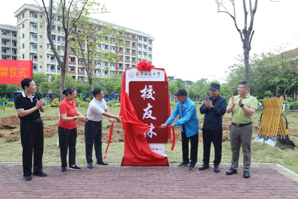 在热烈的掌声中,冯诗炎将捐赠牌交予张松涛。随后,张松涛与校友代表陈小建、陈映红、覃长征、蒙少忠、冯诗炎、刘璐共同为“校友林”揭牌。