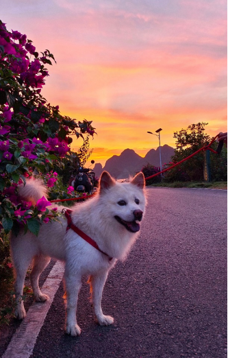 狗狗依然守在三角梅旁,仿佛在与这美丽的景致道别。直到最后一丝余晖消失,它才恋恋不舍地离开,而那夕阳下三角梅的美丽,却永远留在了它的记忆深处,也留在了我们的心中。白狗缓缓地转过身,朝着我走来。它的脚步轻盈而优雅,仿佛刚刚从一个美丽的梦境中走出。当它来到我的身边,轻轻地蹭了蹭我的腿,那一刻,我感受到了一种无言的温暖与陪伴。