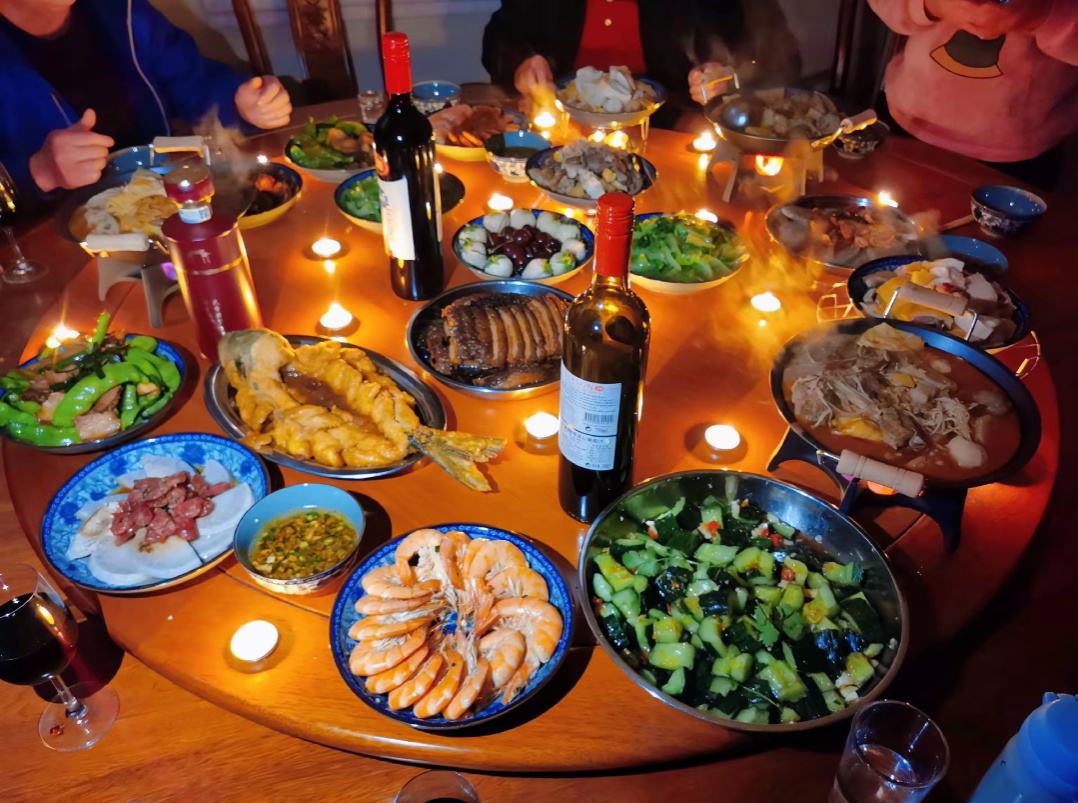 围坐在摆满丰盛菜肴的餐桌前,烛光映照着每个人的笑容。热气腾腾的饺子端上桌,母亲将第一碗递给了祖母,祖母那布满皱纹的手接过碗,眼中满是欣慰与幸福。大家相互夹菜、敬酒,欢声笑语在烛光中回荡。“来,尝尝我做的红烧肉。”父亲一边说着,一边将一块色泽红亮的肉夹到我的碗里。我咬上一口,香甜软糯的滋味在舌尖散开,心中满是满足。