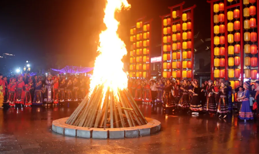 精彩纷呈的民俗表演,演绎出壮乡节日的热烈欢歌。热闹的新年,舞龙舞狮表演必不可少,巨龙腾飞,雄狮跳跃,引得围观的群众连连喝彩。当然,在酒足饭饱之后,穿着传统服饰围着篝火跳舞唱歌也是壮族人民的传统活动。大家手拉着手,象征着壮族同胞团结一心,炽热的火焰则点燃了人们对新年的期盼。