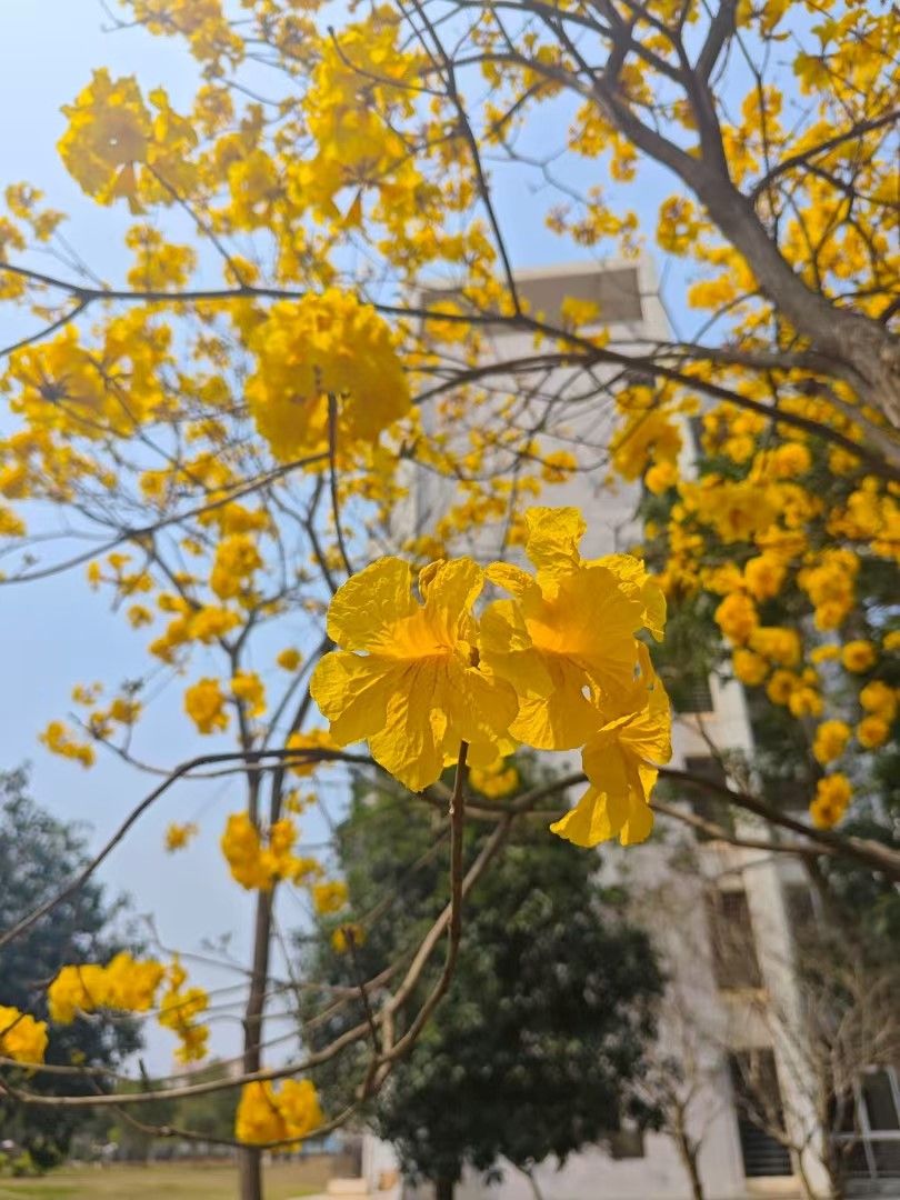 晨雾未散时,黄风铃的金色花瀑已悬在图书馆西侧。赶早八的学生从花帘下匆匆穿过,衣襟沾着晨露与碎瓣,在石板路上投下晃动的光斑。洋紫荆的粉雪总在午后下得急。教学楼转角处,有人抱着书在花雨中驻足,手机镜头对准枝头时,恰好接住一片落在屏幕上的花瓣。暮色漫过校道,零星晚归的学生踩着满地金屑粉絮走过。某个教室的窗台上,不知谁将拾得的花瓣夹进课本,书页间便永远藏着一角春天。