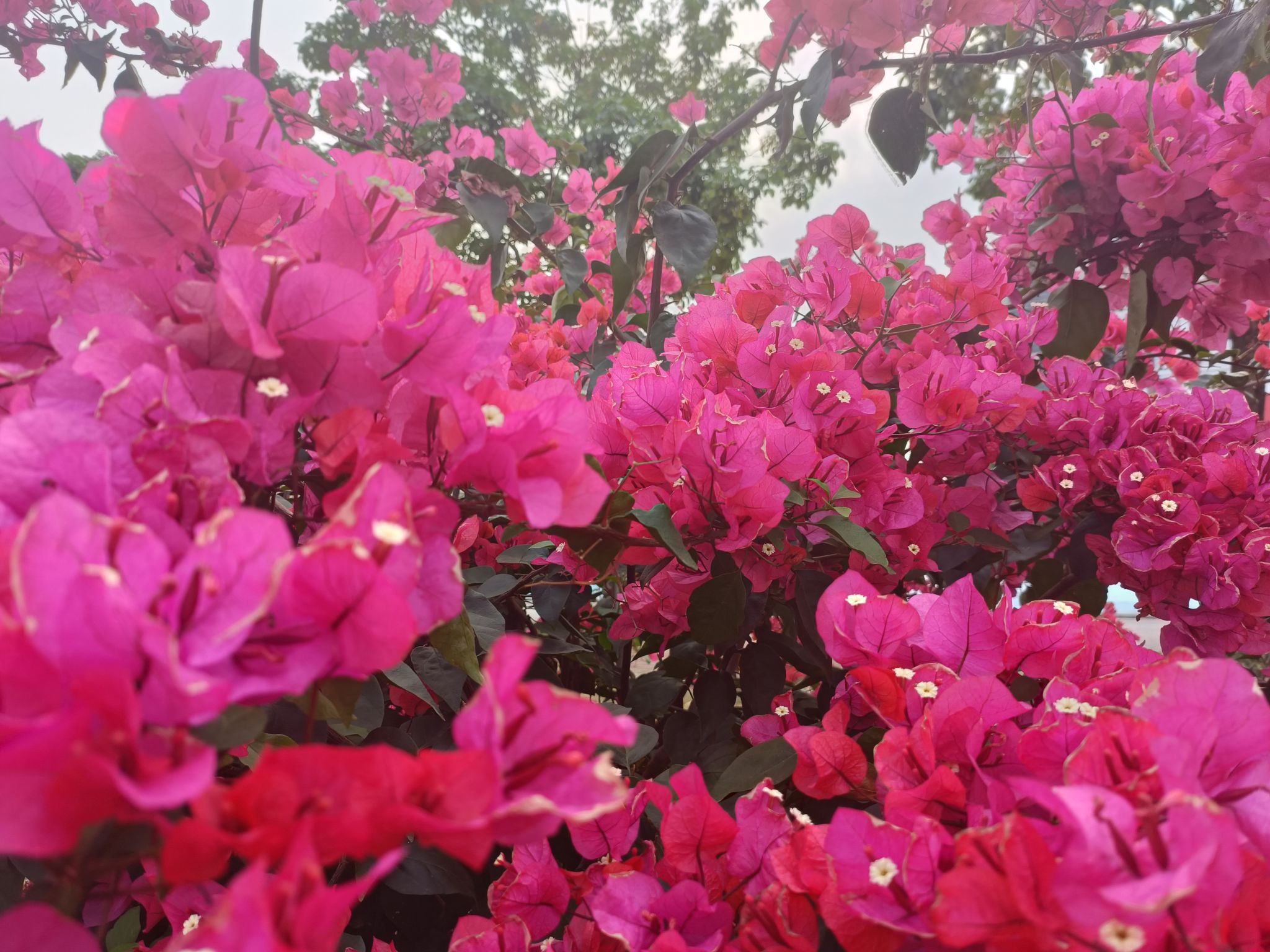 四月的校园,繁花像是被青春的画笔点染,肆意绽放。火红的三角梅如燃烧的火焰般簇拥在枝头,层层叠叠,密密匝匝,点燃了整个校园的激情;黄花风铃木宛如一群身着金黄舞裙的少女,在微风中翩翩起舞;紫荆花肆意地舒展着身姿,白的纯洁无瑕,紫的优雅神秘,粉的娇俏可爱;粉色的桃花,也在枝头羞涩地绽放,宛如青春里那一抹甜蜜的羞涩;还有各种各样的花儿绽放在春色之中。它们共同绘就了四月校园里春意盎然、青春飞扬的绝美画卷。