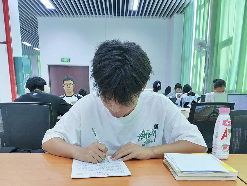 图书馆内,与室外的炎热形成鲜明对比的,是浓厚而紧张的学习氛围。随着四六级考试日益临近,学子们正沉浸在紧张的备考中。图书馆的座位一座难求,同学们早早便来“抢占先机”。室内,只有风扇转动发出的“嗡嗡”声和笔尖在纸上摩挲的“沙沙”声交织。一位戴着眼镜的男生,额头上沁满细密的汗珠,匆匆擦拭后,目光又迅速回到阅读理解的题目上;不远处,一位女生小声地重复着听力原文,努力纠正自己的发音,专注的神情仿佛周围的一切都与她无关。为了能在考试中取得理想成绩,大家都在默默努力着,他们时而紧皱眉头思考难题,时而快速翻阅笔记巩固知识。每一滴汗水都见证着他们的坚持,每一次思考都凝聚着他们的努力。在这酷热的五月,他们以知识为帆,以奋斗为桨,在学习的海洋中奋力前行。