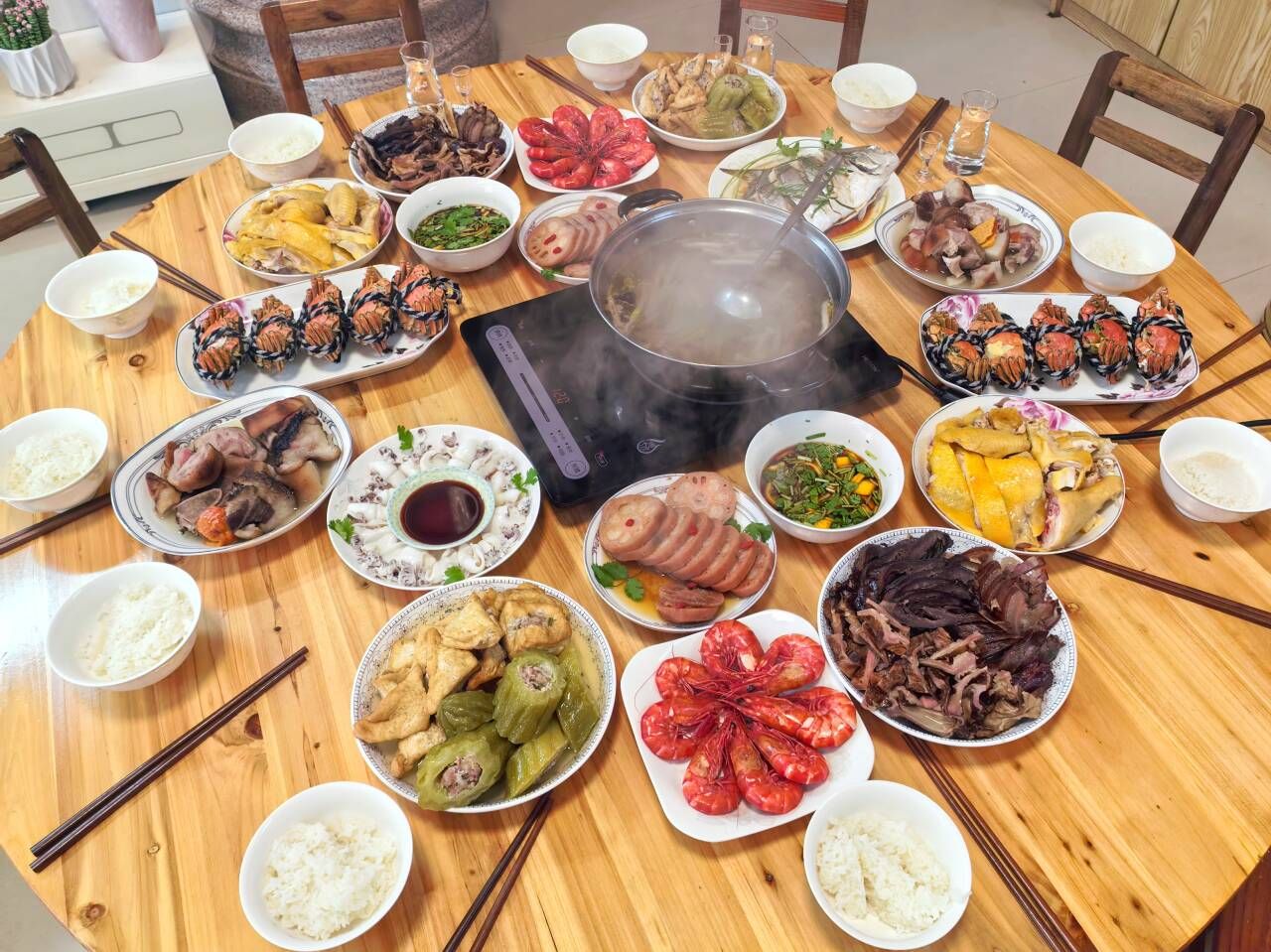 年夜饭的圆桌,是新年最温暖的中心。妈妈在厨房里忙碌,爸爸在客厅里贴福字,我和弟弟在一旁打下手。当热气腾腾的菜肴端上桌,一家人围坐在一起,筷子起落间,是一年的辛劳与慰藉,是家人的闲话家常,也是团圆最温暖的模样。桌上的白切鸡、酿豆腐、五色糯米饭,是凌云的味道,也是家的味道。爸爸端起酒杯,说:“新的一年,平平安安就好。”妈妈给我夹了一块鸡肉,说:“多吃点,在外读书辛苦了。”这张圆桌,盛满了人间烟火,也盛满了家人的爱。
