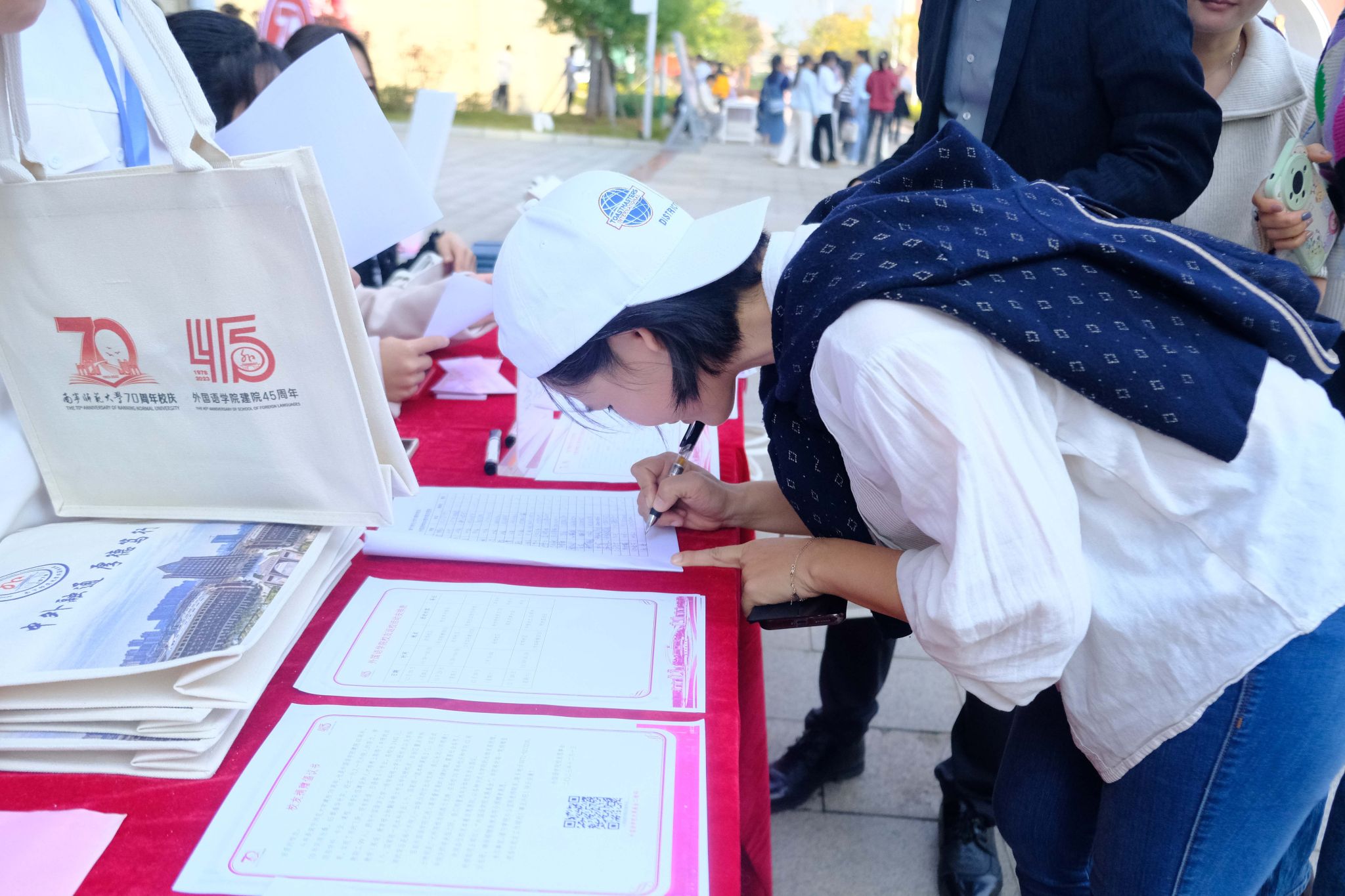 恰70校庆,风华正茂的外国语学院迎来了45周年院庆。在风和日丽的暖冬里,外院的校友们如约而至。外院学子们化身志愿者,给校友们送上专属返校纪念品。在学院办公楼前,专门设置了为欢迎校友返校的签名墙,校友们庄重地在签名墙上留下自己的名字印记,留下“回家”的宝贵记忆。