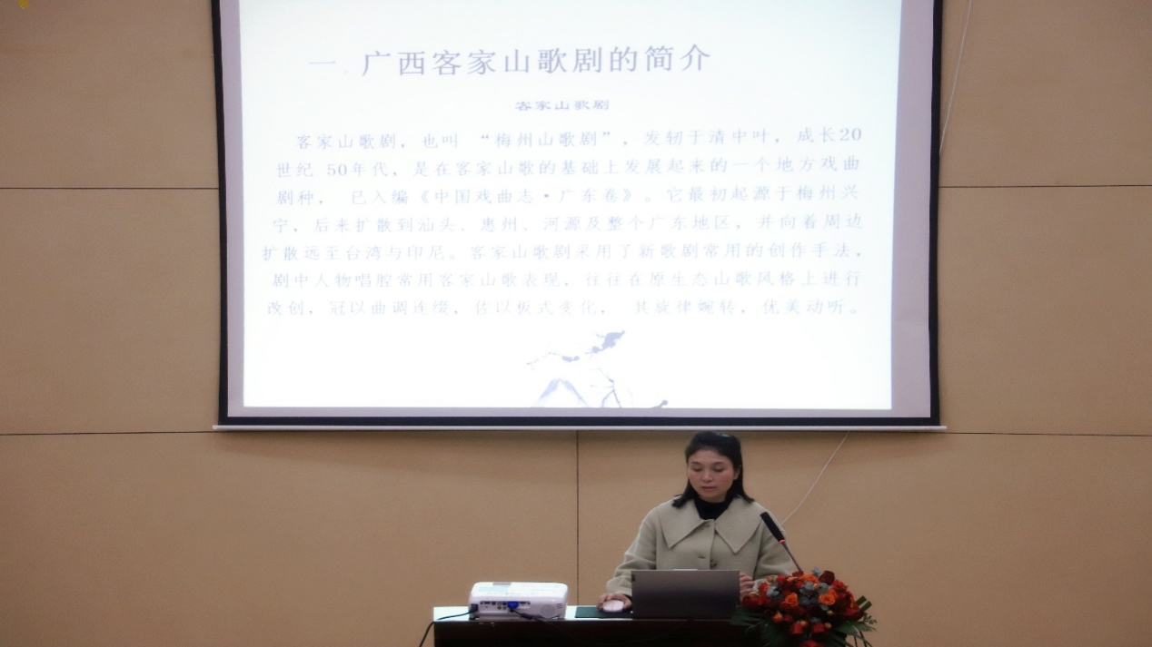 论坛上,黄妙秋院长致辞,她指出:学院积极响应党中央国务院关于非物质文化保护和传承的指示,落实教育部相关要求,高度重视非遗戏曲类保护、传承和进校园的工作,这次青年博士论坛和音乐与舞蹈学院非遗研究小组的成立就是具体的措施之一。论坛旨在通过青年博士们挑起广西戏曲类非物质文化保护、传承与研究的大梁,带动青年教师,共同推进非遗戏曲类的研究和进课堂,成为学院非物质文化遗产学科和专业建设,非物质文化遗产师资队伍培养的重要平台。接着,与会专家学者在论坛上作报告。特邀专家广西民族文化艺术研究院文化遗产部副主任黄羽在论坛上首先做《非物质文化遗产保护的广西实践》报告。她从国际层面、国家层面,对广西非物质文化遗产中的传统戏曲类遗产的保护现状与方法进行系统介绍,对广西传统戏剧类进入校园进行了深入探索。我校学报编辑部玉璐博士在《从“小家”到“大家”的民族共享节日 ——以国家级非遗瑶族盘王节为中心的考察》中,提出瑶族盘王节从家族仪式逐渐演变为政府主导和民间组织参与的民俗节庆,最后成为各民族共享的非物质文化遗产节日文化。从民族学的角度对非遗进行了探索。学院唐文生博士生做了《青春版大型彩调歌舞剧〈刘三姐〉在地方院校的传承和创新》报告。他认为,地方院校要结合自身的条件积极落实和修改教学目标和教育的目的,调整专业人才培训计划和方案发展彩调艺术,促进和推动广西高校艺术教育的改革。王克永博士在《广西客家山歌剧传承与发展等问题的思考》中,分析了客家山歌剧的流行地区、戏剧表演形式并对传承与发展问题进行探讨。许毓晓博士以《非遗视域下古骆越族群历史文化记忆的舞蹈创作研究》,探讨了广西壮侗语先民的古骆越民族舞蹈中所蕴含着民族文化和民族精神,并通过舞台化的个案研究,探讨非物质文化遗产的有效性保护与活态性传承。李曼霞博士做了《非遗戏曲教学与传承研究——以南宁师范大学为例》的报告。她从政策解读、课程设计、教学实施等层面,对高校的非遗戏曲教学、传承、实践与研究进行分析和探讨。刘明华博士在《广西壮族“末伦”文化与传承漫谈》中提出:“末伦”具有浓郁的民族特色和艺术能力,也是最具有代表性的壮族曲艺品种。在多元的新时代,它也需要顺应现代社会的发展进行革新。我院非遗研究小组成员马松青和黄夏分别做了题为《广西戏曲音乐特征分析》,《广西戏曲传习中身段语言探索》的交流。学院谢育坚副教授,校友周小玉、郑经平、陈梦婷以及参会学生进行了现场提问,与讲演的七位博士围绕学术研究的热点与趋势、地方戏曲传习课程设置、非遗戏曲在中小学的传承等方面开展了充分热烈的讨论和交流。最后,南宁师范大学音乐与舞蹈学院地方戏曲传习班为论坛带来了广西文场、京剧非遗教学成果表演。论坛在迎新春的祥和气氛中圆满闭幕。