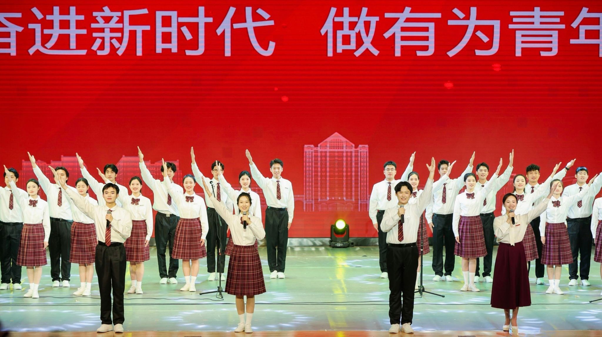 随后,学院播音与主持艺术专业教师唐衍欢、校友银诗、张灵智、2022级播主班李青峰等人担任晚会主持人。晚会第一篇章由我院师生代表参加的《奋进新时代,做有为青年》朗诵表演拉开序幕。