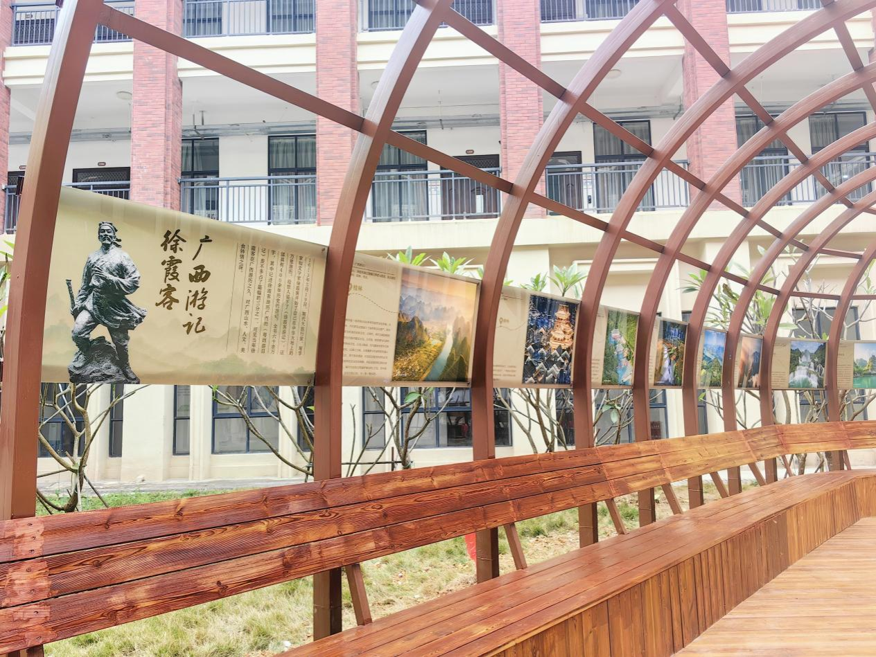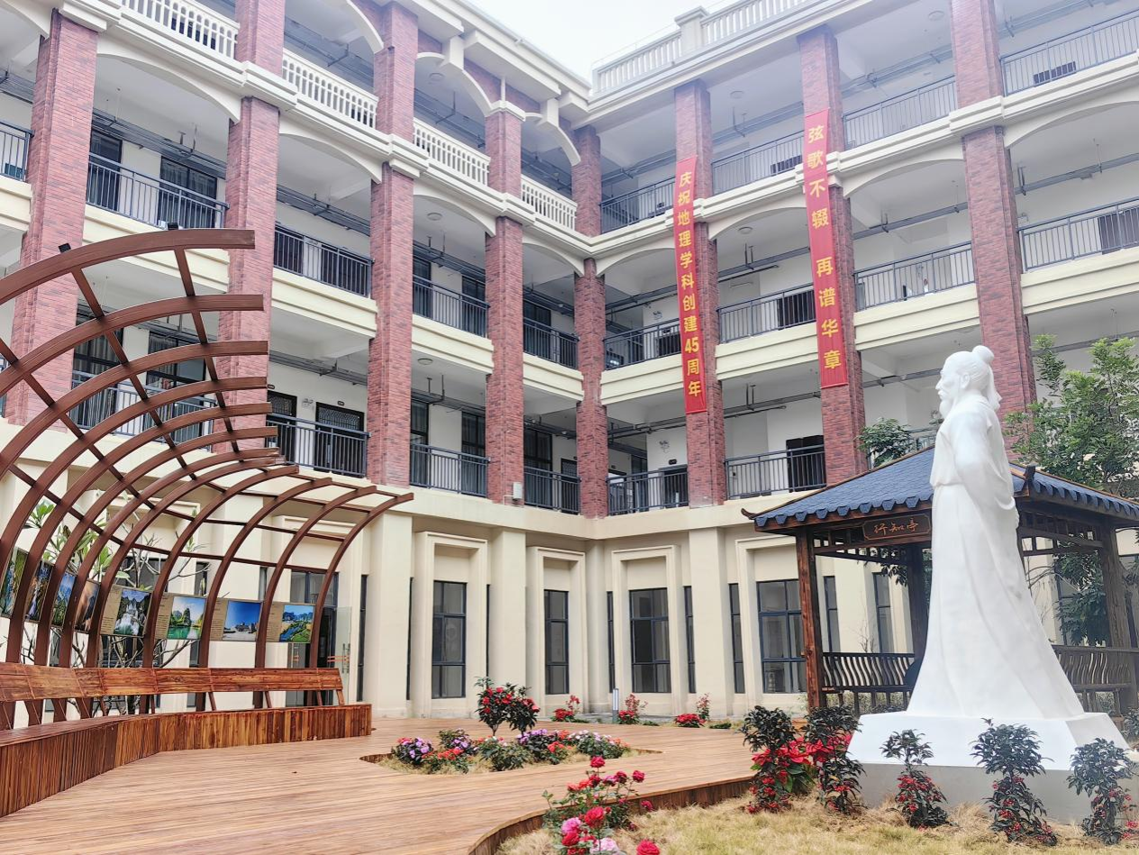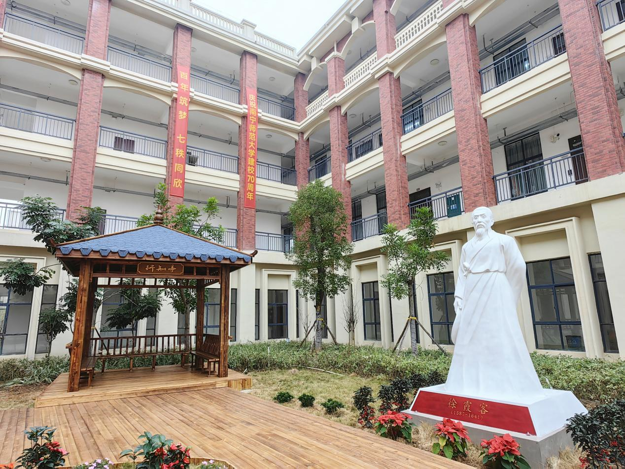 突出学院地标,打造地理实践园。通过对地源楼庭院重新装饰改造,以徐霞客雕塑、行知亭、廊架宣传展示画、植被为核心元素,打造集调查、测绘、研学实践为一体的教学场所,面积约640平方米,进一步增添我院的人文元素和气息。