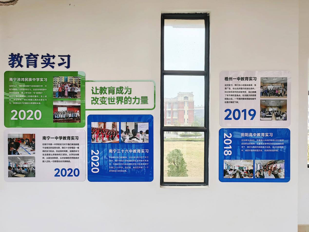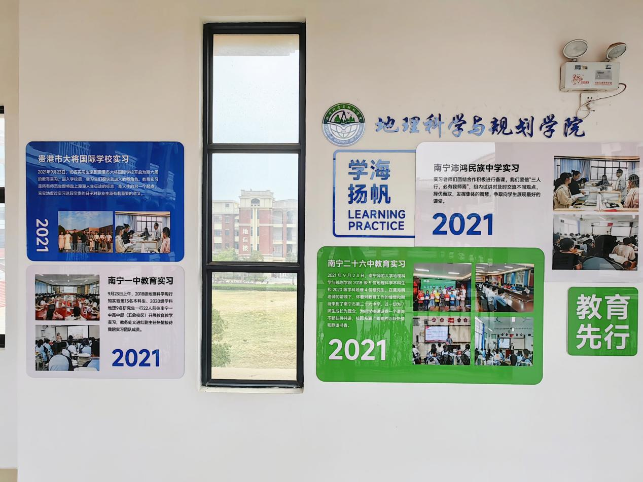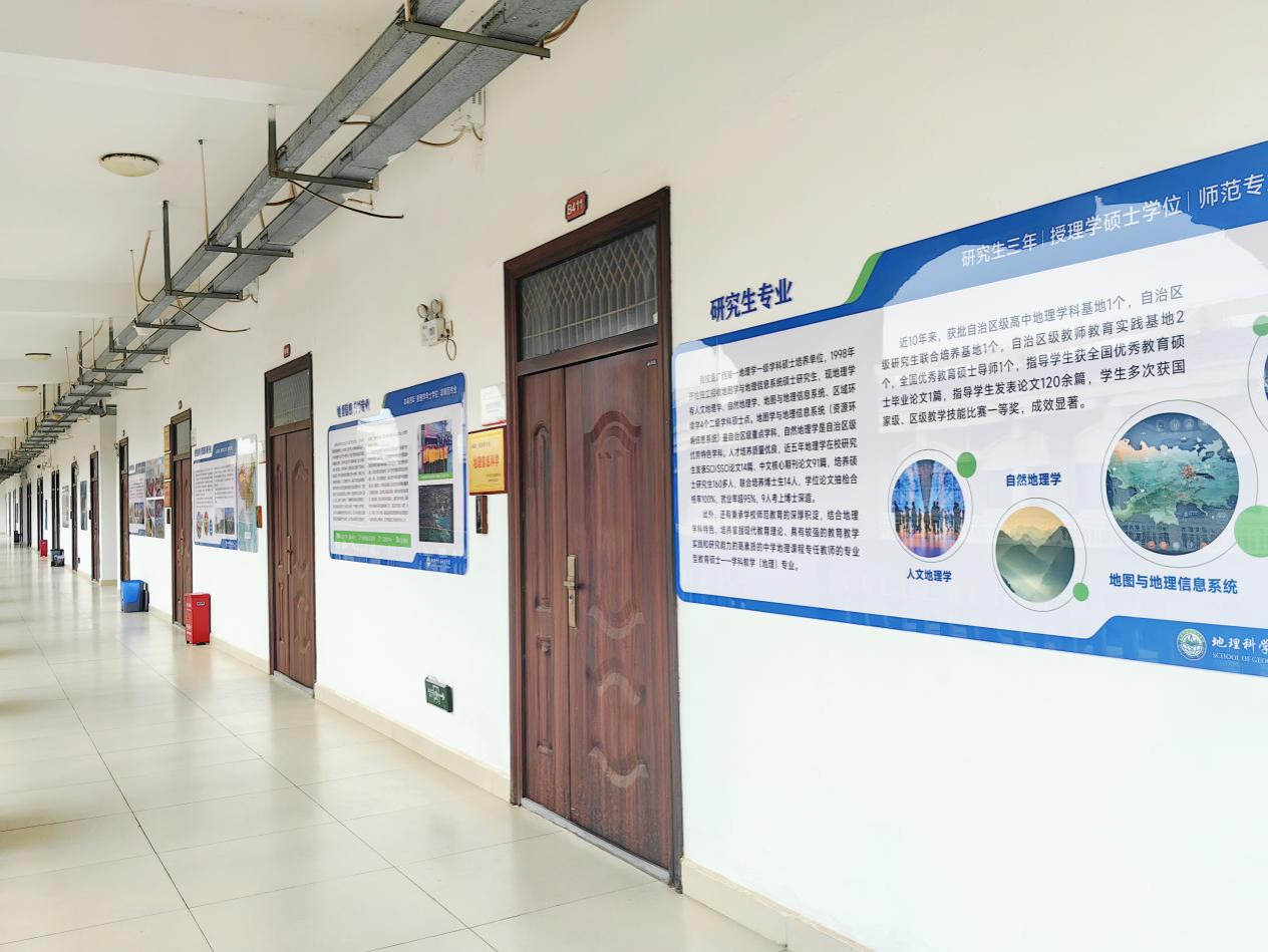 立足专业特色,优化学习环境。通过对地源楼一至四楼的教学区、办公区、走廊和楼道美化改造,展现“山江海边少”中国名山、广西的大山,广西的大江大河,广西的海岸、海港,边境和少数民族风情等地理元素和中外地理学者介绍等主题内容,打造学院长廊文化,引导学院教职工和学生宣传教育中潜移默化中强化荣誉感和使命感。