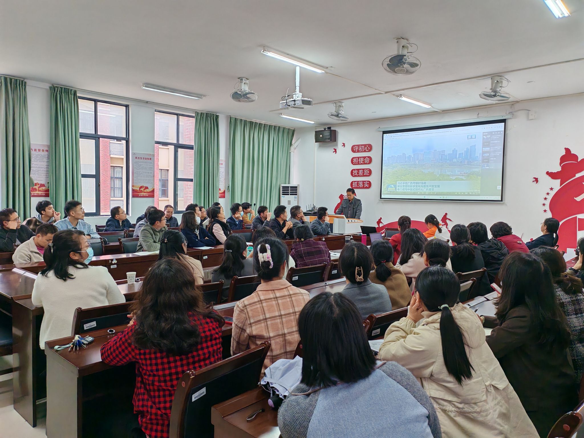 会上,全体教职工认真观看了习近平总书记视察广西的新闻联播,深刻领悟习近平总书记视察广西重要讲话精神。