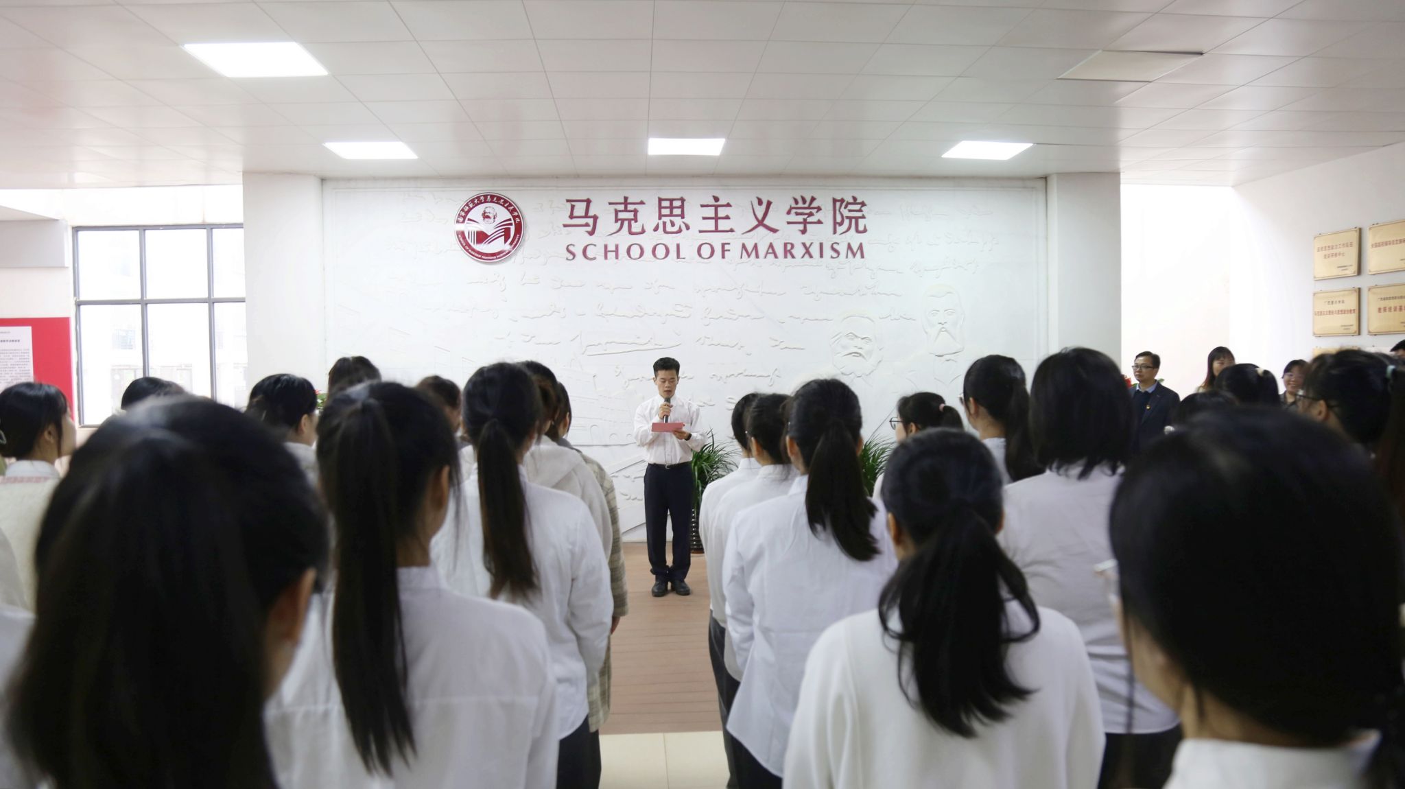马克思主义学院新发展党员入党宣誓仪式于1月9日在五合校区8栋B座2楼马克思主义理论教育广场隆重举行。出席本次活动的有马克思主义学院党委书记李玲、党委副书记黄志海、马克思主义基本原理研究生党支部书记姜黎黎、本科生第一党支部书记李夏阳、本科生第四党支部书记张万景、本科生第五党支部书记王玉香、辅导员黄业毅以及新发展党员们。