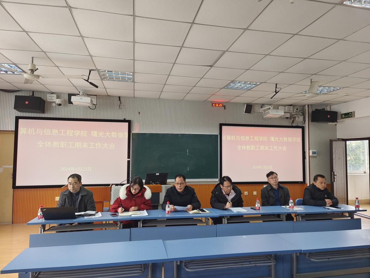 1月23日,计算机与信息工程学院/曙光大数据学院在明秀校区文星楼315教室召开全体教职工期末工作大会,学院领导班子及学院全体教职工参加。学院党委书记余朝文主持会议。