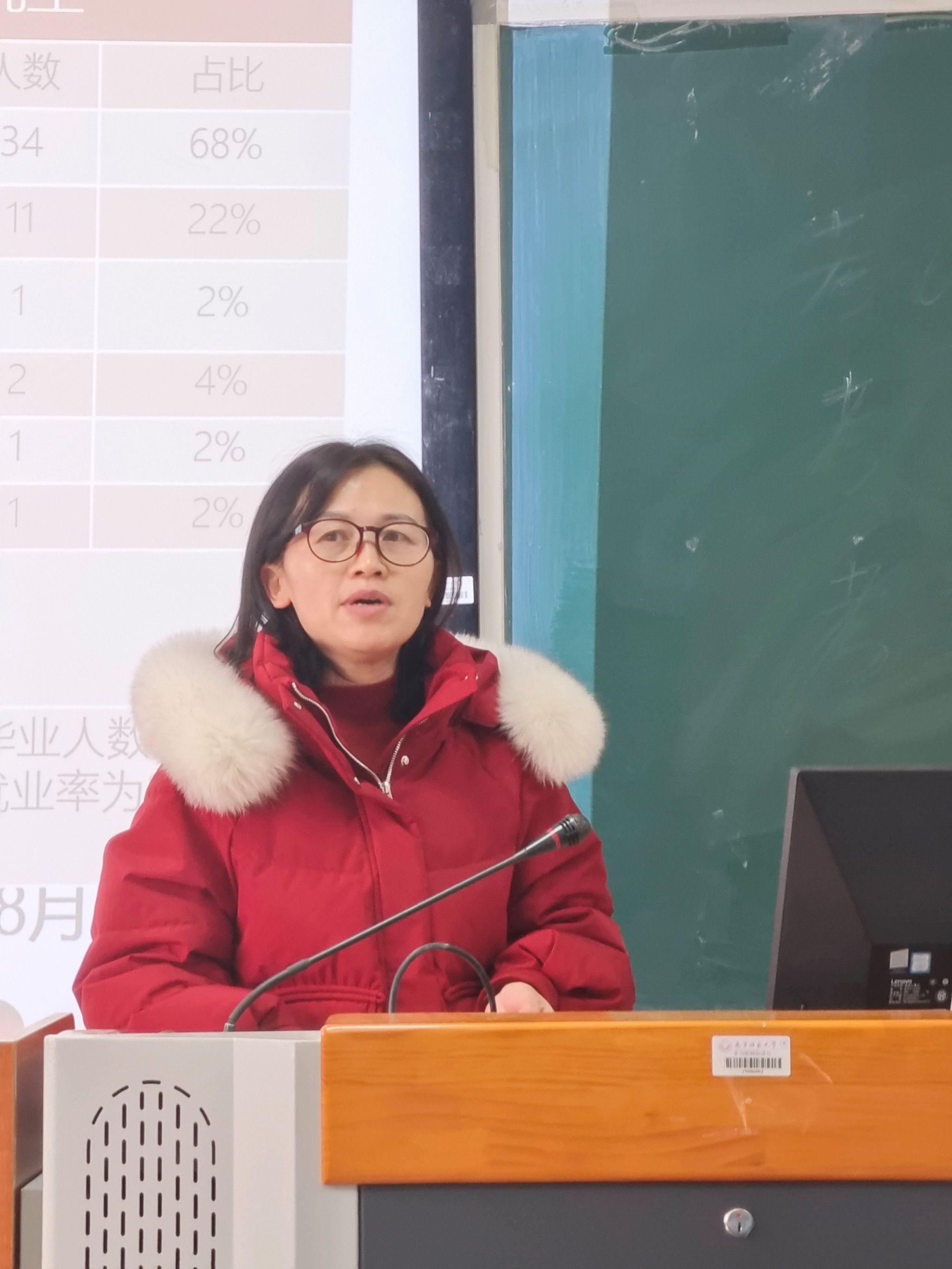 会上,由党委副书记韦柳温作2023届的就业创业工作总结,全面详细通报2024届毕业生基本情况和当前就业创业工作推进情况以及下一步的工作建议。2024年的就业创业工作主要结合学生就业意向摸底调研,包括学生意向的就业地区、就业行业、目前所具备的能力和求职情况,与2023年就业分布情况作了对比,结合当前就业形势,分析学生当前就业心态,并提出下一步工作的具体举措。韦副书记提出三点工作建议:一是各导师组加强与学生联系,营造良好氛围,及时缓解求职压力,树立求职信心,给予学生更有针对性的就业指导帮扶和岗位推荐;二是引导学生找准求职定位,提醒学生抓住求职黄金期,充分做好就业准备,积极参与求职就业;三是挖掘就业政策,用好政策性岗位的吸纳作用,帮助学生用好、用足就业政策,提高学生就业质量。