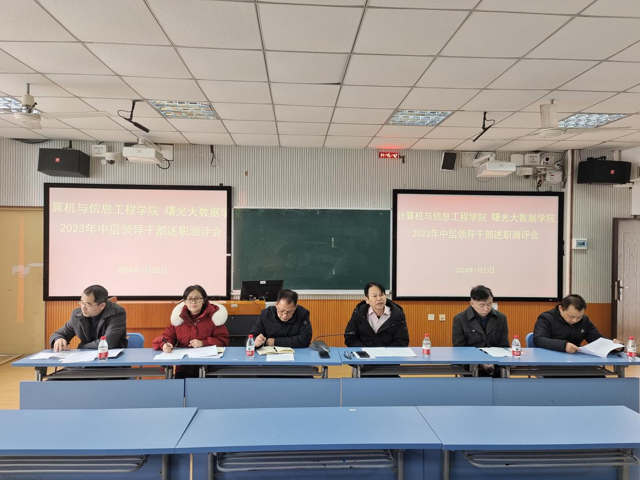 1月23日,计算机与信息工程学院/曙光大数据学院在明秀校区文星楼315教室召开2023年中层领导干部述职测评会,完美(中国)组织部姜宁同志到场指导,学院领导班子和全体教职工参加,会议由学院党委书记余朝文主持。