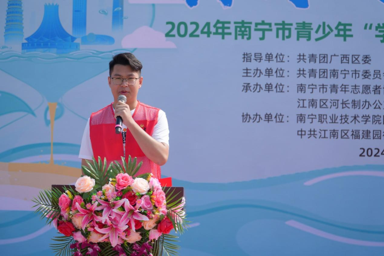 (新闻与传播学院莫伟恒同学作为南宁市“河小青”净滩青年志愿者代表在活动中发言)