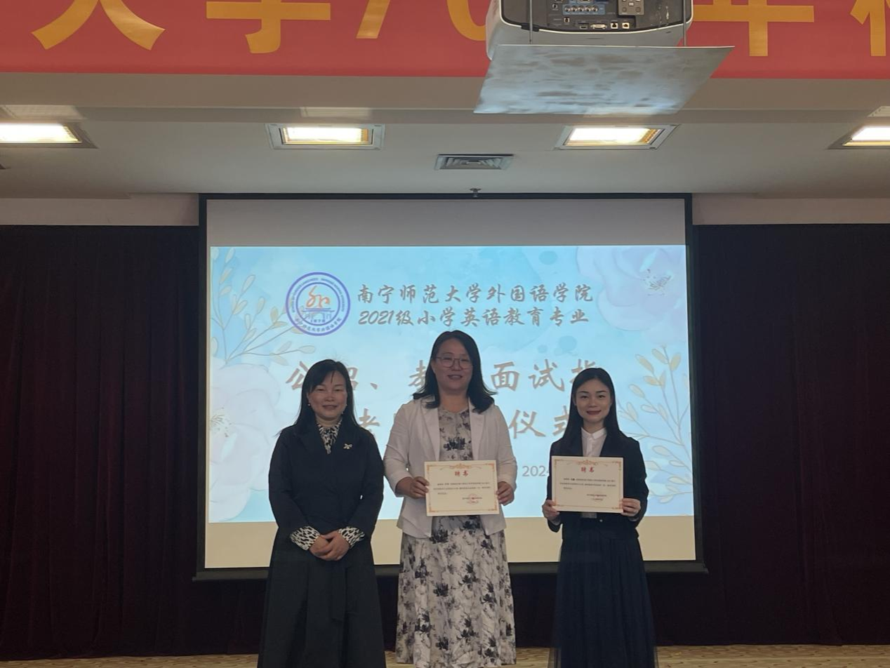 南宁师范大学外国语学院副院长高飞雁副教授为南宁市华衡小学的领导老师颁发聘书,并诚挚地感谢南宁市华衡路小学对我院毕业生公招、教资面试指导方面的大力支持。随后由南宁市华衡小学宁罕校长和科研主任韦静老师依次发言,给同学们带来了宝贵的面试和就业经验,也体现了南宁市华衡路小学对培养新一代教育工作者的重视,对我院开展各项活动的大力支持。