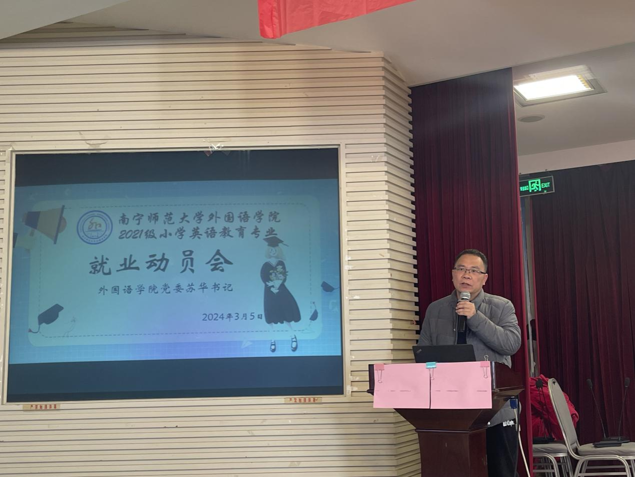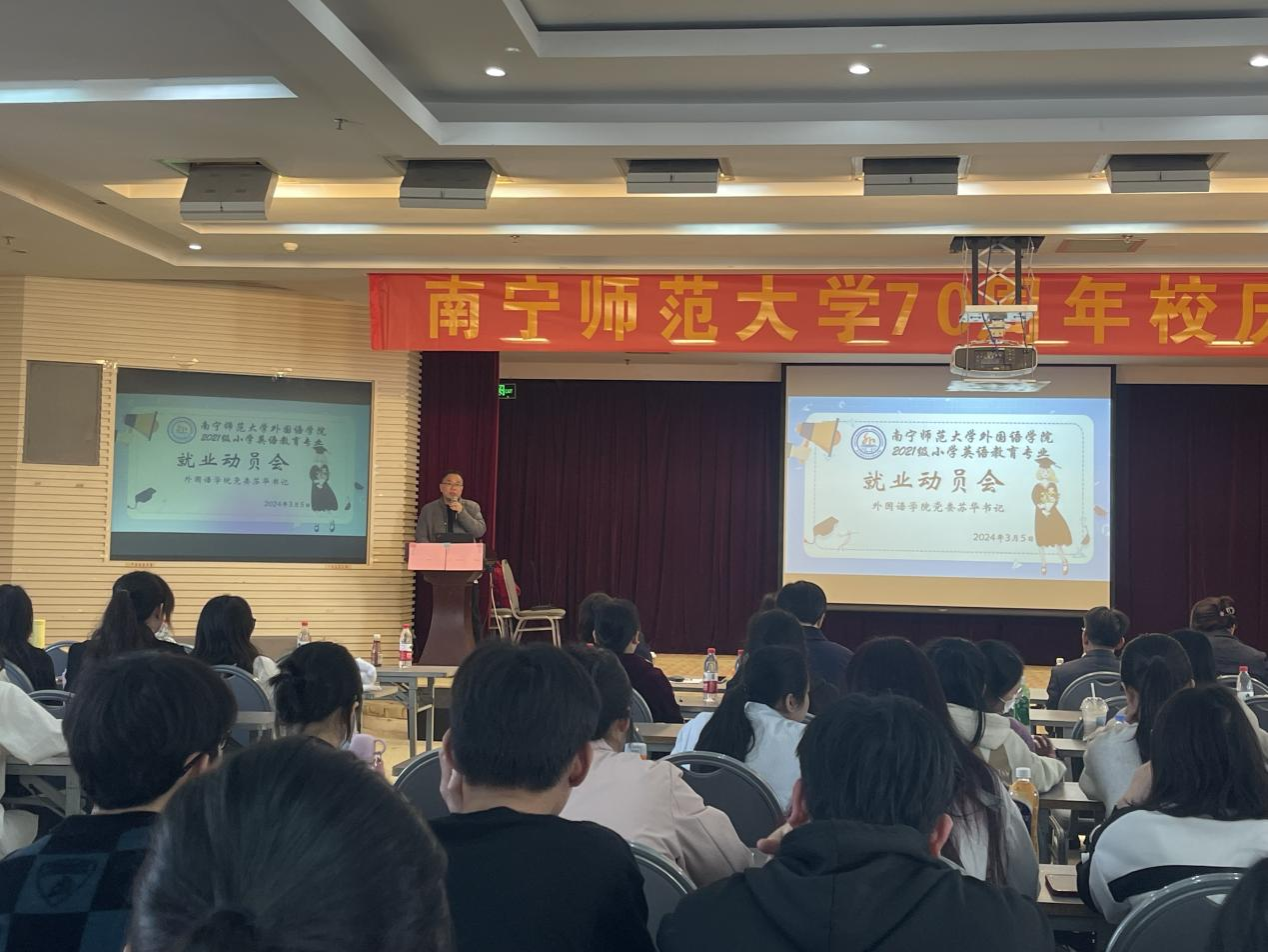 为提高毕业生就业积极性和主动性,引导毕业生树立正确的就业观念,2024年3月5日下午,外国语学院2024届小学英语教育专业毕业生就业动员大会在南宁师范大学建政校区教育大厦18楼召开。外国语学院党委苏华书记、高飞雁副院长高飞雁、辅导员兼毕业班班主任邓梦芸老师、2021级普专全体在校师生参加本次活动,活动由辅导员主持。