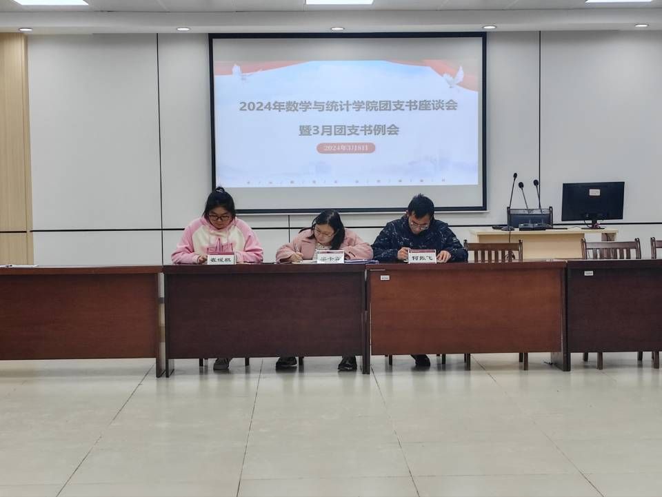 为做好新学期学院团委工作,听取各团支部对于新学期工作建议,进一步探讨共青团员思想政治教育方式,3月8日下午,数学与统计学院在实验1-A601教室召开了新学期团支书座谈会暨3月份团支书例会,该院辅导员梁卡霖、何振飞老师、团委学生会常委崔媛棋以及各班团支书参加会议,会议由梁卡霖老师主持。