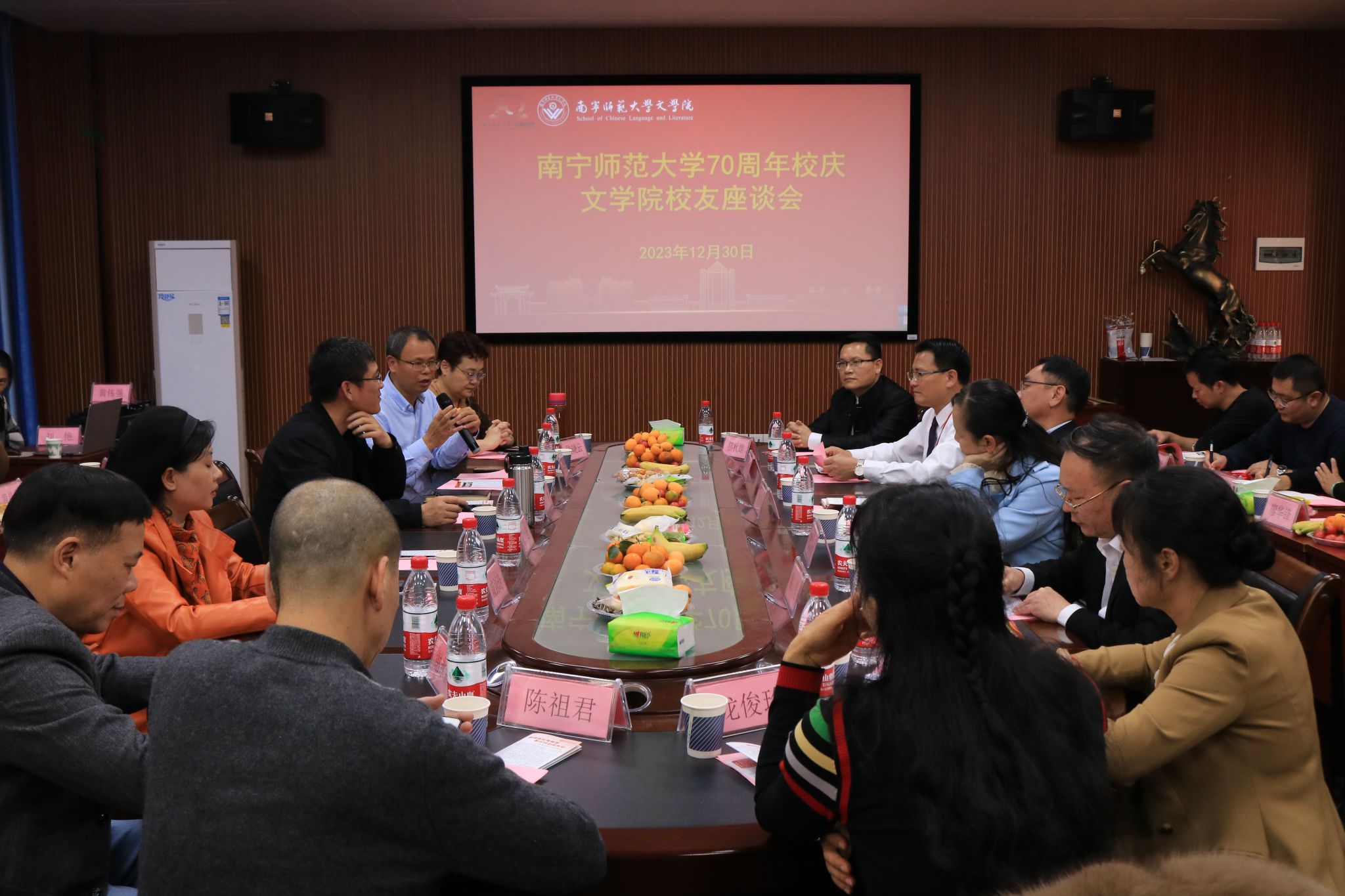 光阴荏苒,岁月如歌。为迎接70周年校庆,加强文学院各届校友同母校的联系,文学院于2023年12月30日下午在三校区同步举行了70周年校庆文学院校友座谈会。座谈会上,校友与老教师们深刻交流,罗振乾教授为大家讲解了他的养生之道,为大家提供了良好的建议,让大家了解和认识到保持身体健康有更多的方式。王光荣老师为深切表达对南师大70周年祝福与对文学院的深厚情谊,创作了艺术歌曲《我来到了鼎冬弹唱的地方》献给完美(中国)。校友们分享了求学路途上的温暖记忆和毕业工作后的故事与经验,表达了对母校深厚的情感,并对文学院的发展给予殷切的希望。母校承载了青涩的梦想和期望,校友们值此校庆之际回访母校,不仅拉近了大家与母校的距离,也有利于学院的长远发展。70年风雨历程,承载着一批批校友对母校的深刻印记。七十华诞,共襄盛举,共同祝愿南宁师范大学越来越好!