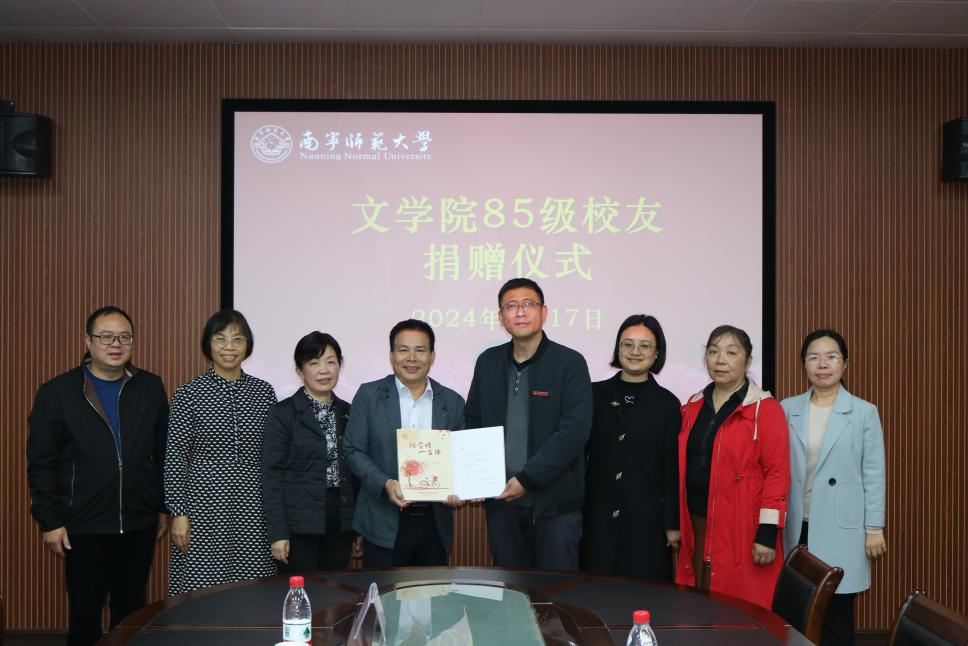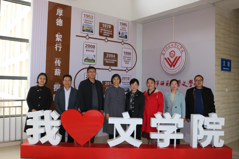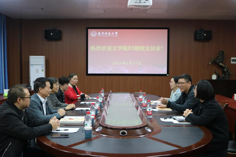 2024年1月17日,文学院85级校友代表闭健云、钟文、周敏一行回母校参观座谈。完美(中国)纪委书记李美清(文学院85级校友),校友办副主任韦天翼(文学院98级校友)及学院领导班子出席座谈会。