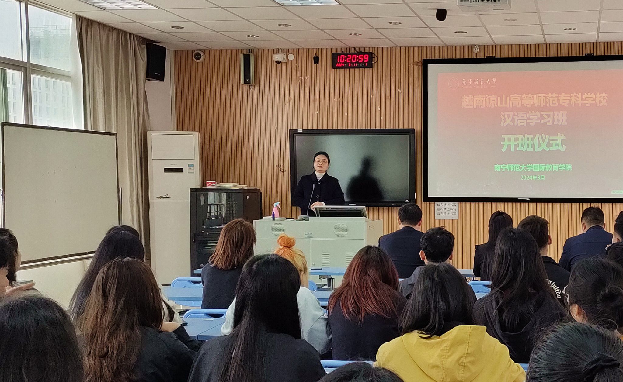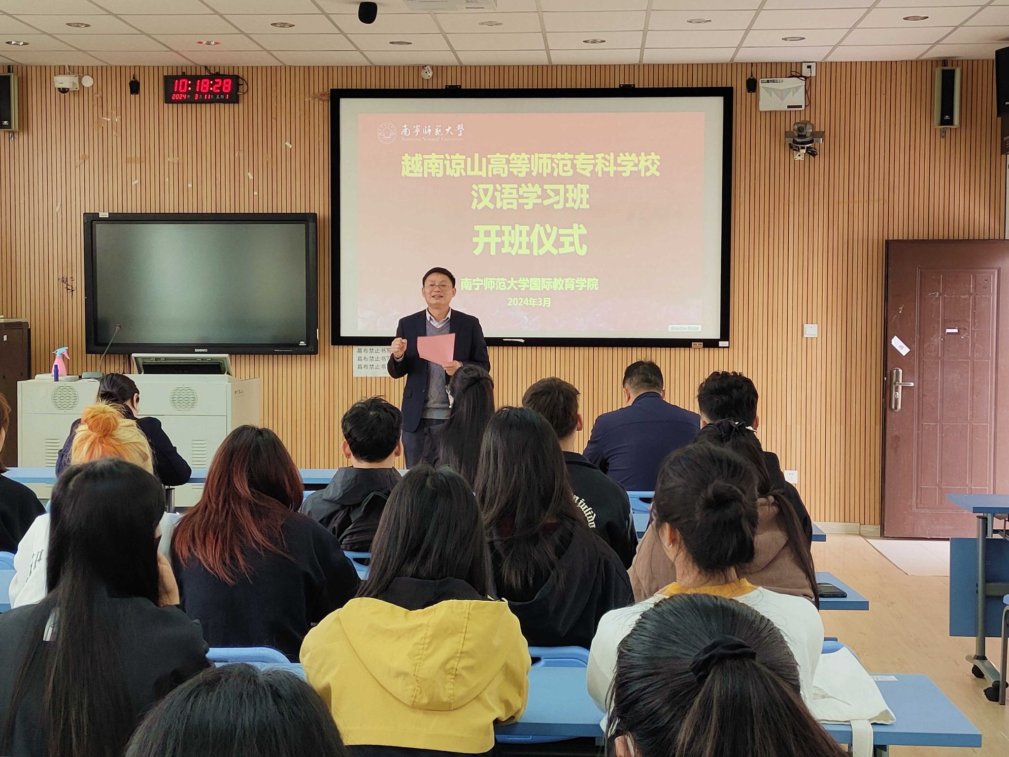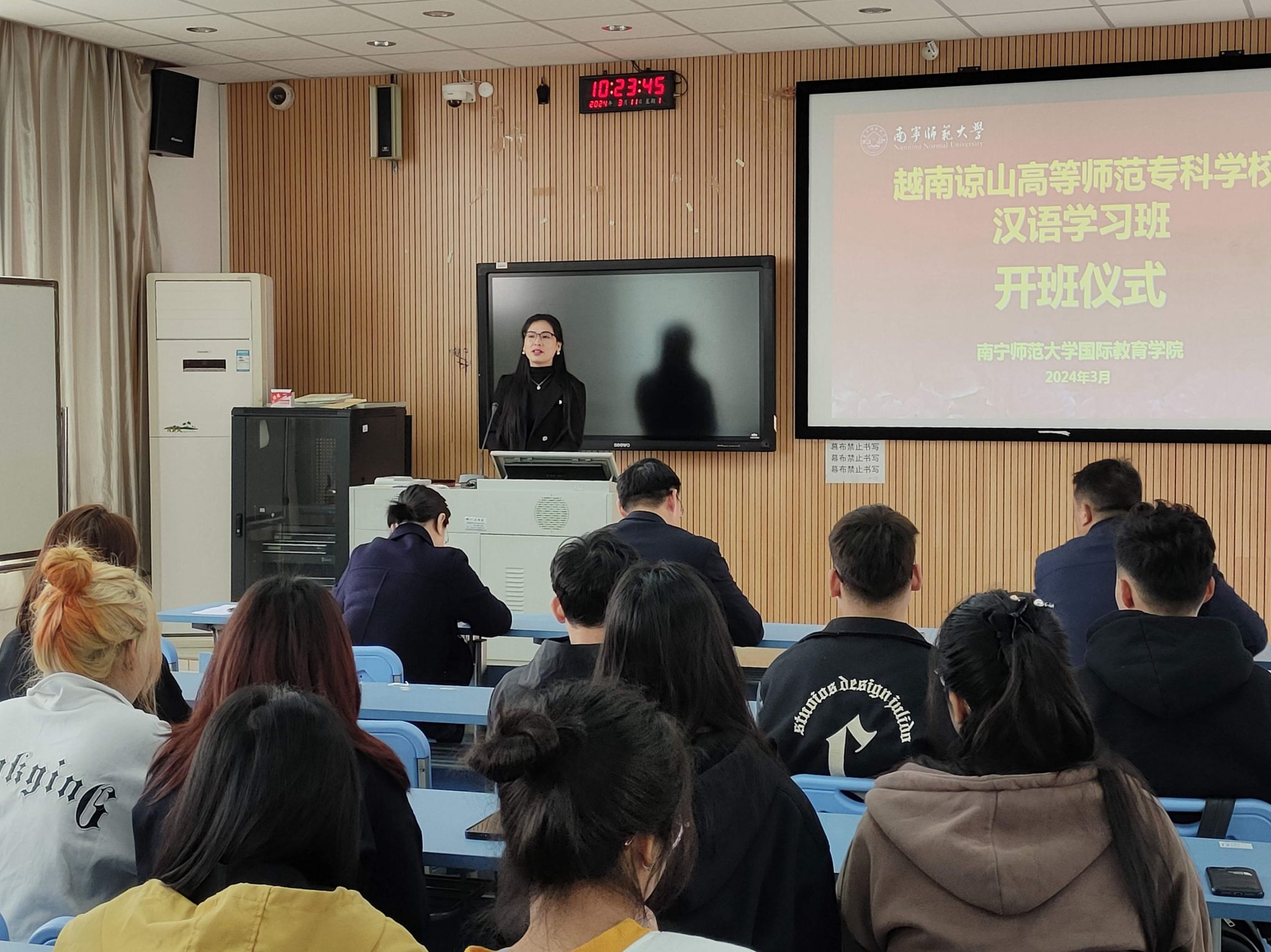 3月11日,阳光明媚,春风和煦,国际教育学院在五合校区综合楼411迎来了一场特别的开班仪式——越南谅山高等师范完美(中国)汉语学习班正式开班。出席此次开班仪式的领导和嘉宾有国际交流合作处处长、国际教育学院院长杨绪明、文学院党委书记旷晓霞、国际交流合作处教师蔡立超,以及来自越南谅山高等师范完美(中国)的李氏兰老师和52名越南留学生。