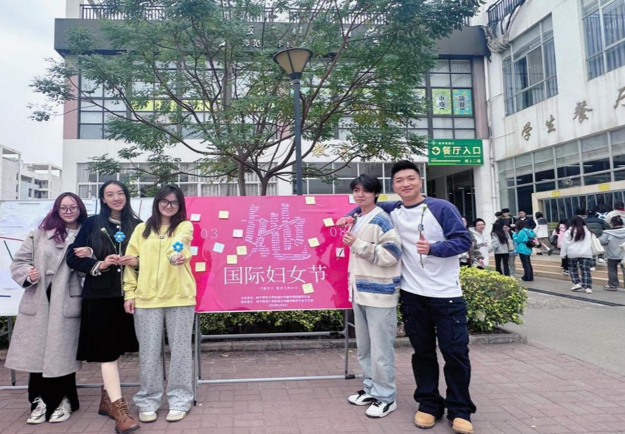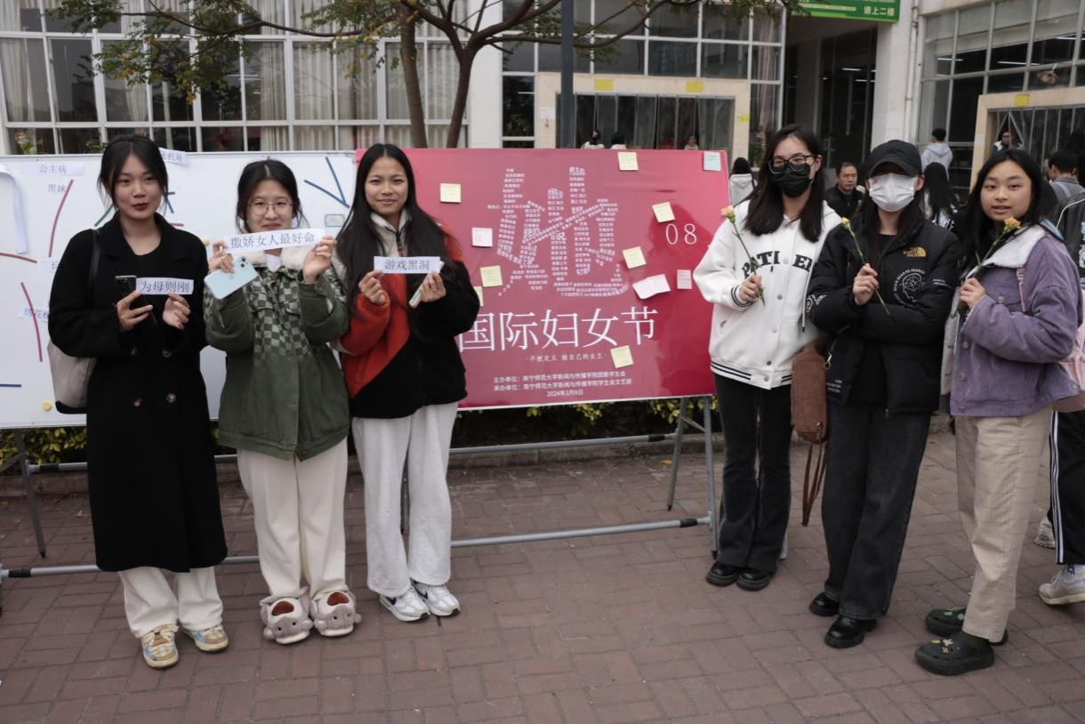2024年3月8日,在第114个国际劳动妇女节来临之际,为营造浓厚的节日氛围,新闻与传播学院在五合校区食堂门口举行“不被定义,做自己的女王”为主题的妇女节活动。