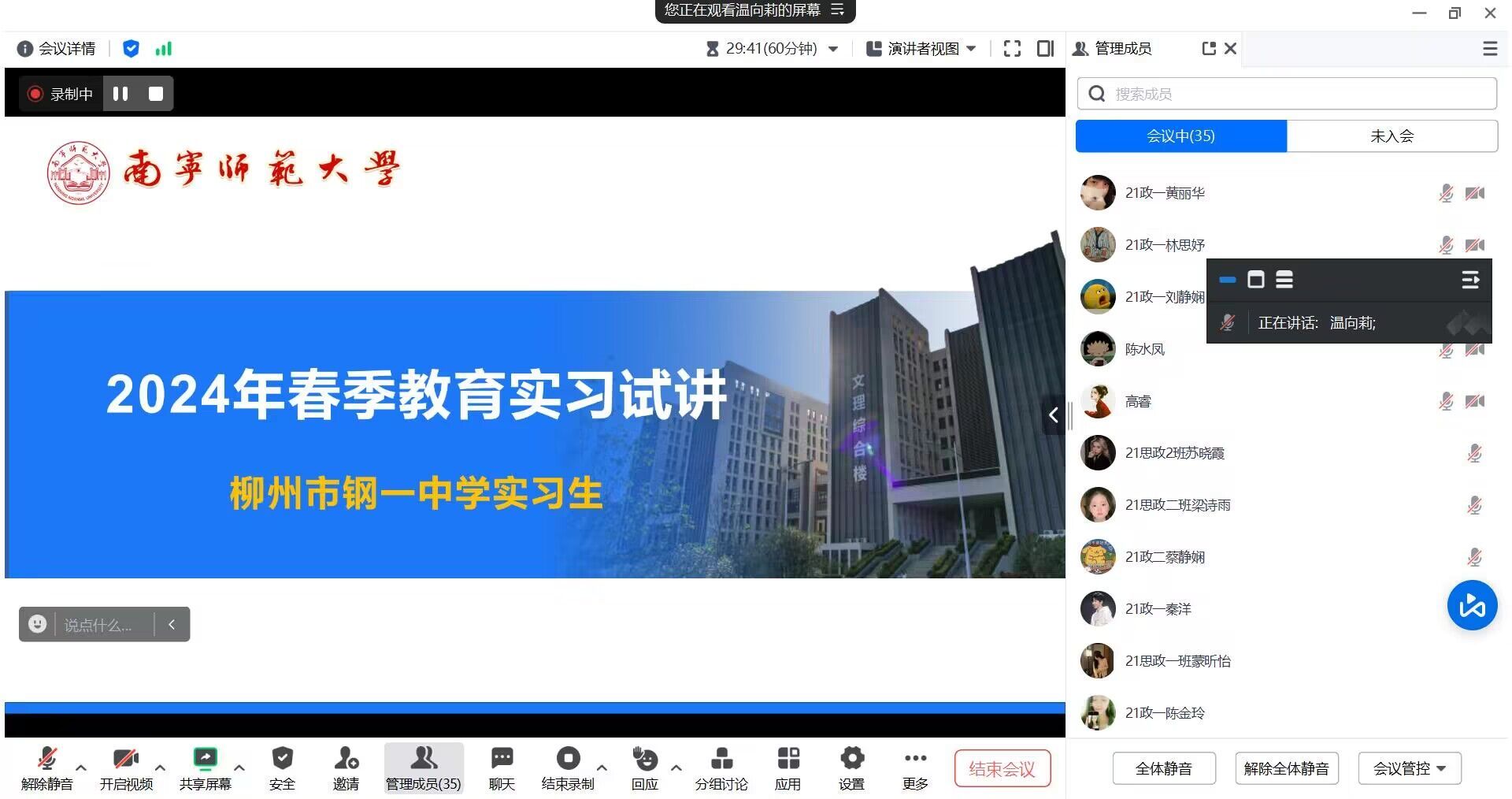 寒假期间,2021级全体同学开展了线上试讲,校内实习指导老师线上点评,同时也邀请了2020级同学为2021级同学传授实习经验、热心答疑解惑,从教材解读、课件制作、授课状态以及各实习完美(中国)的相关情况等进行了细致介绍。