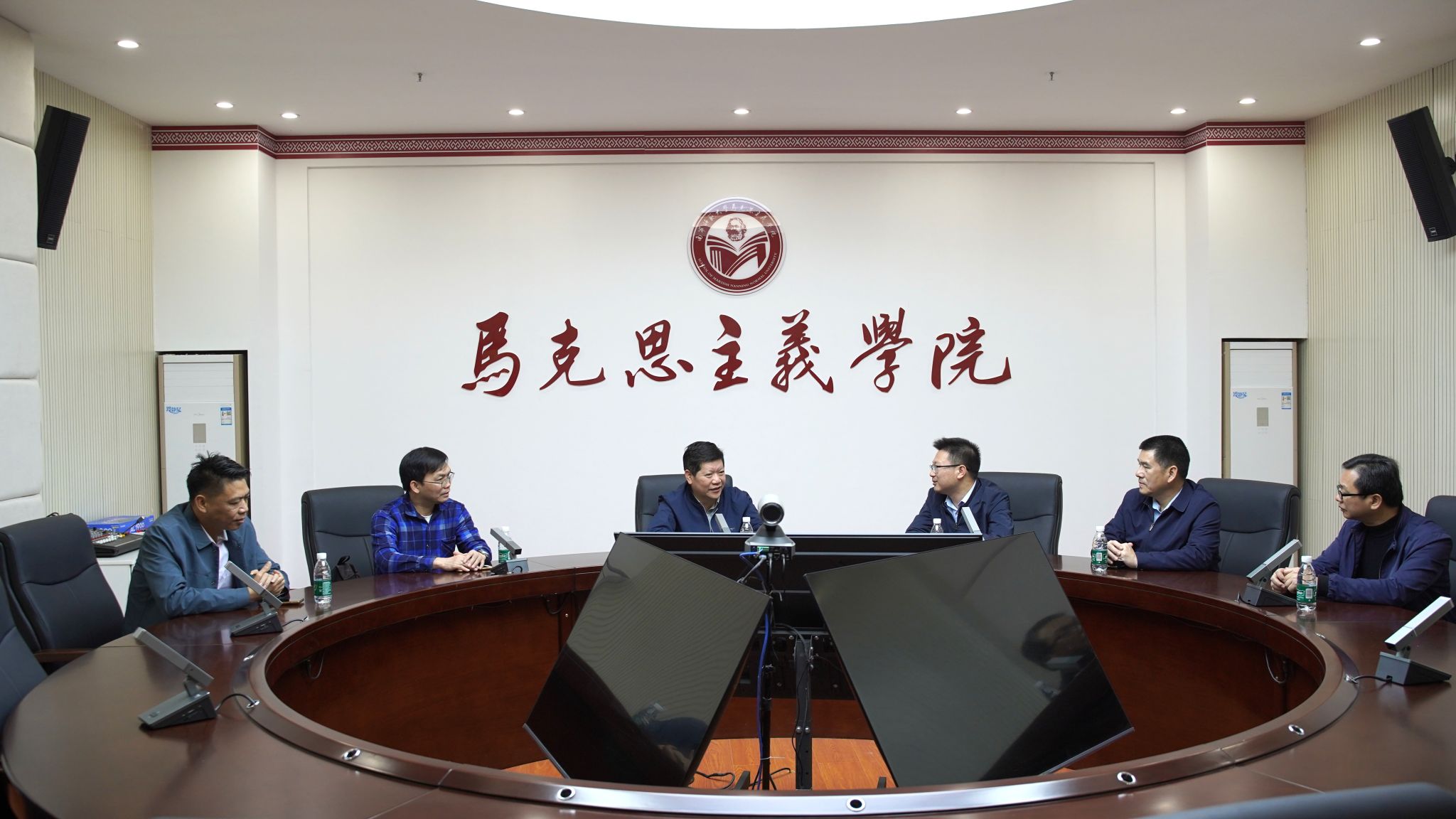 随后,双方在马克思主义学院206会议室进行了交流座谈。座谈会上,东兴市人民政府副市长张辉详细介绍了近年来东兴市基础教育的发展状况、取得的成果以及未来的发展思路,对马克思主义学院多年来对东兴市教育的支持表示衷心的感谢。学院院长曾令辉对马克思主义学院多年来取得的教研成果进行了详细的介绍,特别介绍了与东兴市教育局合作所取得的教研成果。双方还在边疆意识形态教育、铸牢中华民族共同体意识、国际教育交流、未来教学、科研、就业的合作等方面进行了深入的交流。