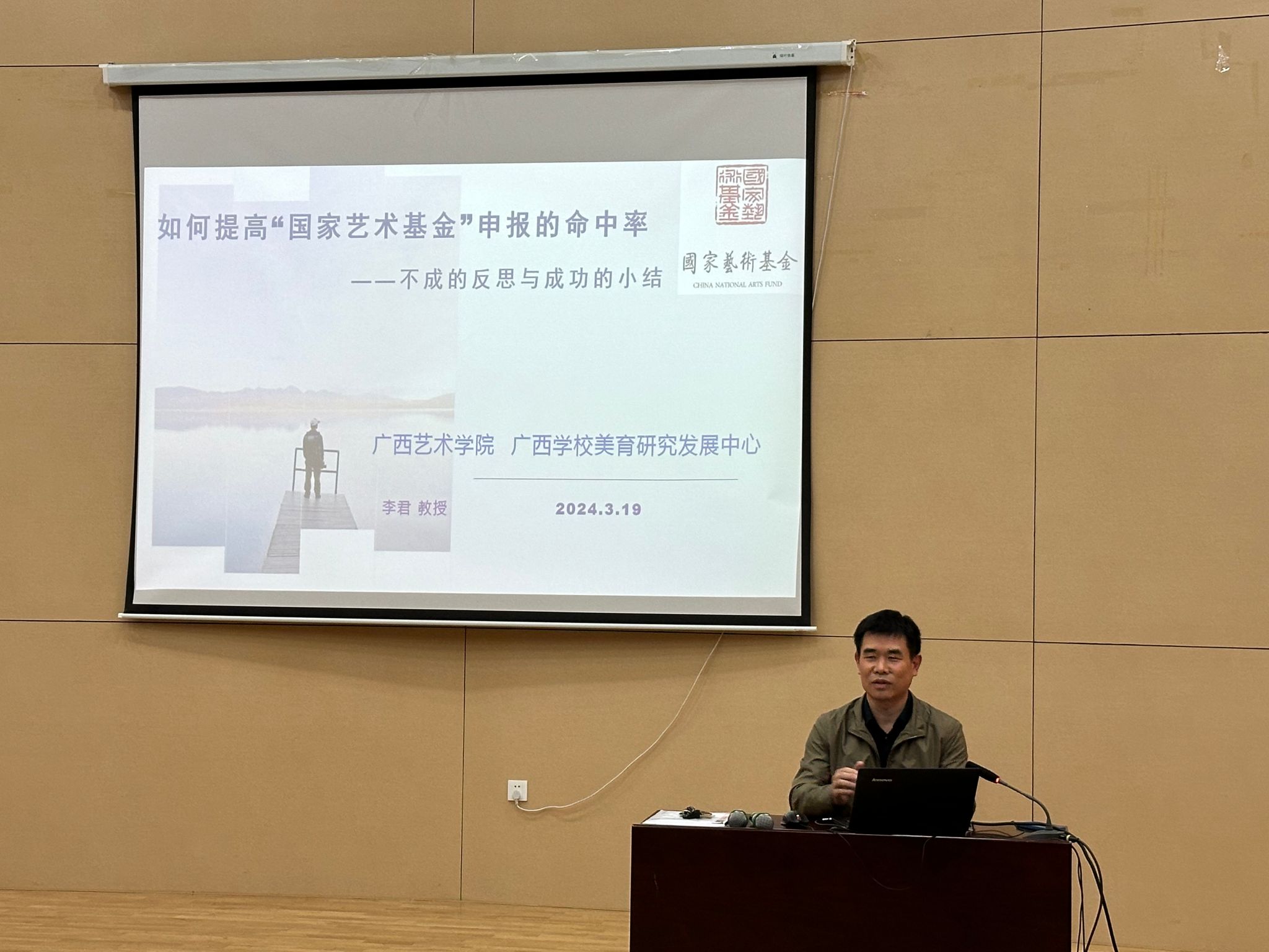 讲座中,李君教授以“如何提高‘国家艺术基金’申报的命中率”为主题,围绕项目申报要求、填写系统的文字策略、项目达标原因、跨界融合项目等方面进行了详细讲解。从各类项目主体的申报量和立项等情况展开,深入分析了不同地域、不同类别的立项项目。讲座内容充实新颖、交流气氛热烈,促进了我院师生对于项目申报国家艺术基金的了解,开拓了师生项目申报领域新思路。最后,李君教授向师生们提出殷切期望,希望广大师生找准落脚点、踊跃申报。