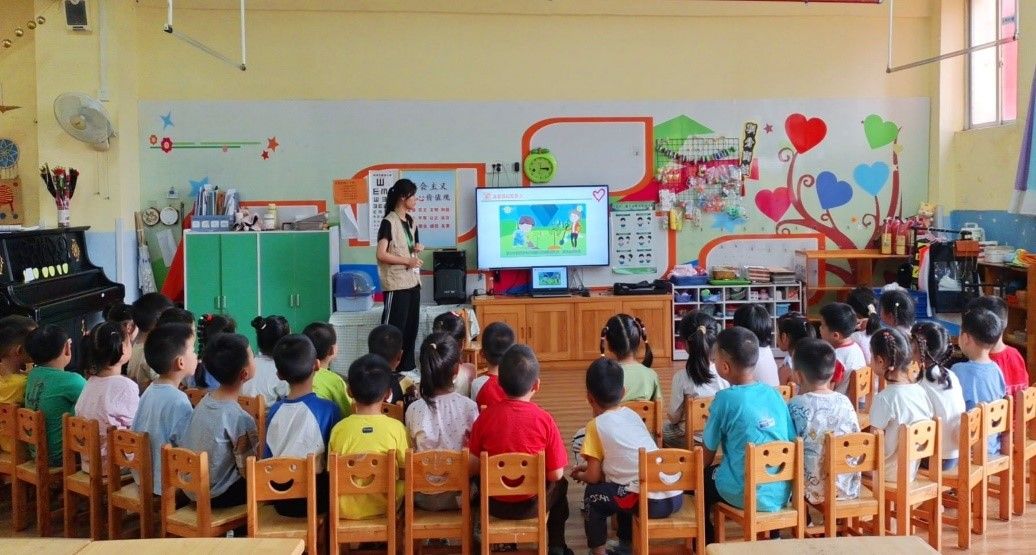 活动伊始,支教部志愿者和支教队员们带着充沛的热情和丰富的知识走进各班教室。随后,支教队员带领中班的小朋友们一起探讨“春天的秘密”,观赏春天的景象,了解春天大自然变化的原因等。与此同时,大班的小朋友们也正认真听着主题为“地球爷爷发烧了——温室效应”的知识小课堂,不仅认识到了温室效应的产生和影响,同时也学习到了如何减少碳排放,保护地球环境。课堂上,小朋友们踊跃发言,积极参与其中。