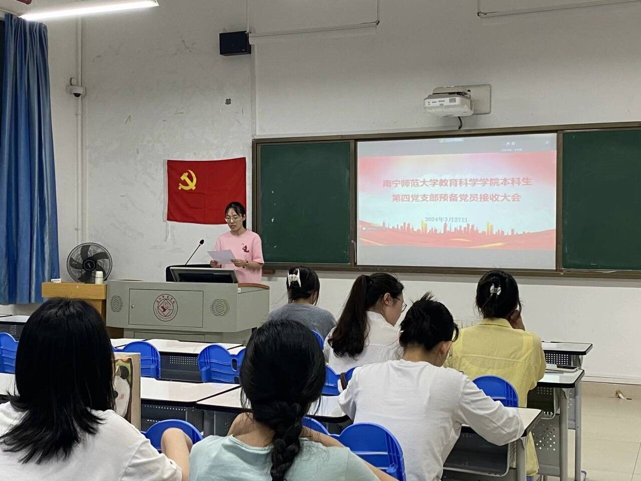 3月27日晚,南宁师范大学教育科学学院本科生第四党支部在五合文综314教室召开了预备党员接收大会。支部书记苏华老师出席了会议,我院本科生第四党支部全体党员参加了会议。