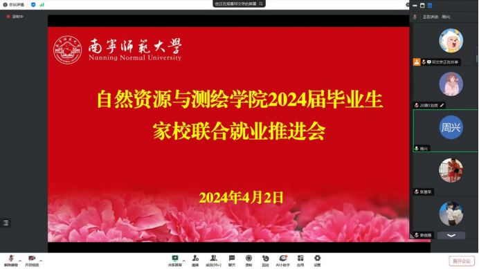 为扎实推进学院2024届毕业生就业工作,充分发挥家校联动作用,帮助毕业生家长及毕业生了解就业形势、把握就业机会。4月2日晚上,自然资源与测绘学院以腾讯会议形式召开2024届毕业生家校联合就业推进会。参加本次会议的有学院党委书记黎先、副书记莫雅兰、副院长杨小雄、副院长段炼、周兴教授及各系主任、全体毕业生家长及毕业生。会议由团委书记张慧荣主持。