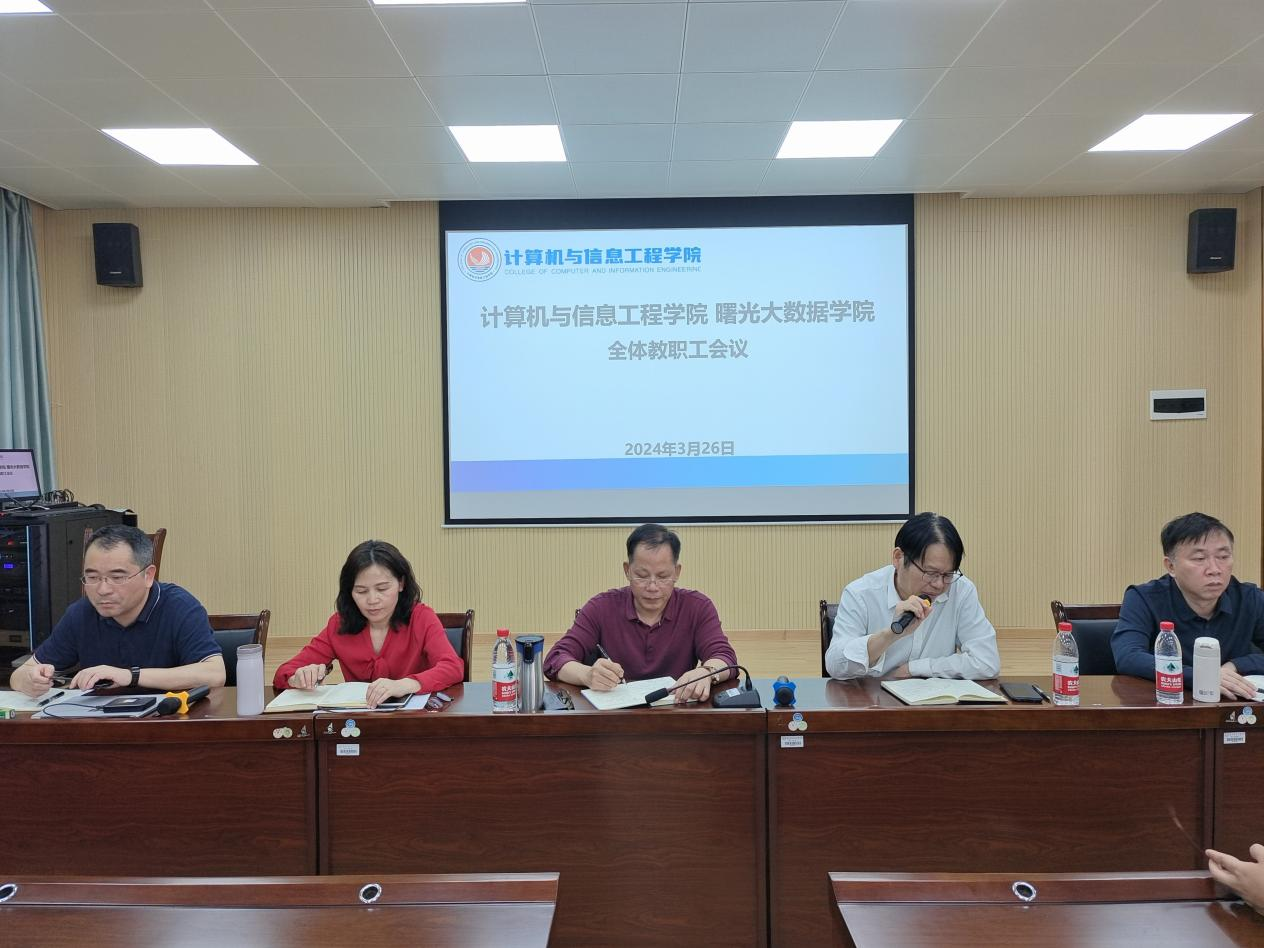3月26日,计算机与信息工程学院/曙光大数据学院在地信楼A301教室召开全体教职工会议,计算机与信息工程学院/曙光大数据学院领导班子和全体教职工参会。会议由计算机与信息工程学院/曙光大数据学院党委书记余朝文主持。