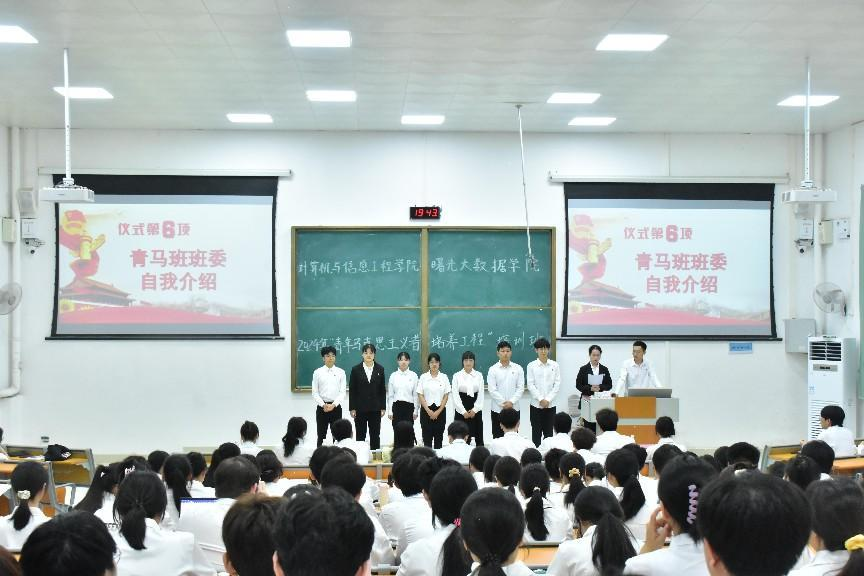 在庄严的团歌声中,全体起立,共同回顾并宣读了入团誓词。伴随着雄壮激昂的团歌,开班仪式正式拉开序幕。宋宏斌老师发表致辞。他对青马班的学员们提出要求,鼓励大家积极参与社会实践,勇于担当,发挥表率作用,将个人理想融入国家发展大局,实现自我价值与社会价值的双重提升。随后,“青马班”学员代表陆小甜同学上台发言。她表示,作为新时代的青年,我们要严于律己,不断提高自身素质,努力成为马克思主义的坚定信仰者、积极实践者和广泛传播者。