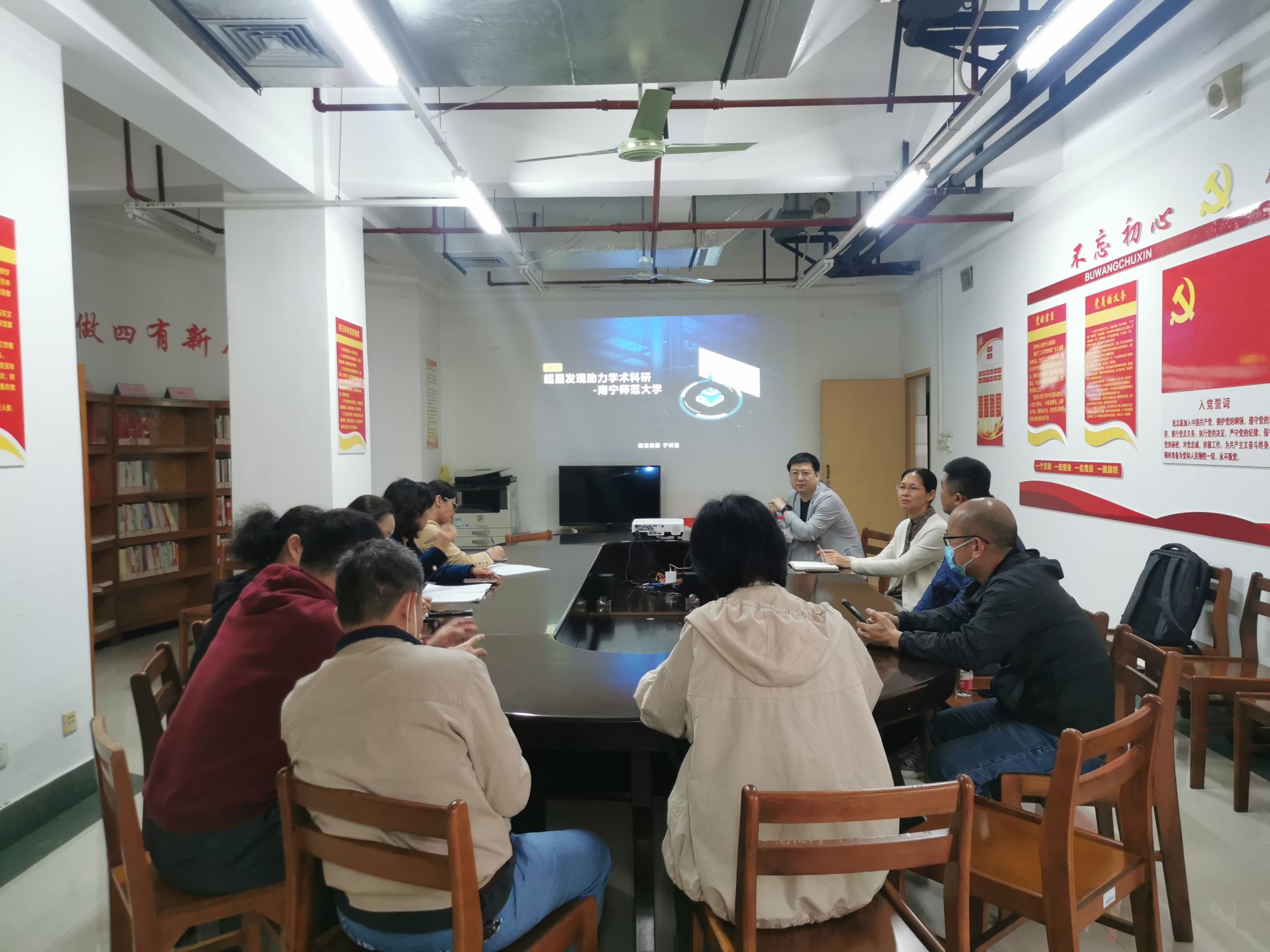 4月8日上午,图书馆在明秀馆11楼会议室开展业务学习培训,超星集团于树涵经理作了题为《超星发现助力学术科研》的讲解。本次业务学习会由叶佩珍馆长主持,图书馆信息咨询部、采编部、阅读推广部、技术部、办公室等部门馆员参加了本次业务学习。